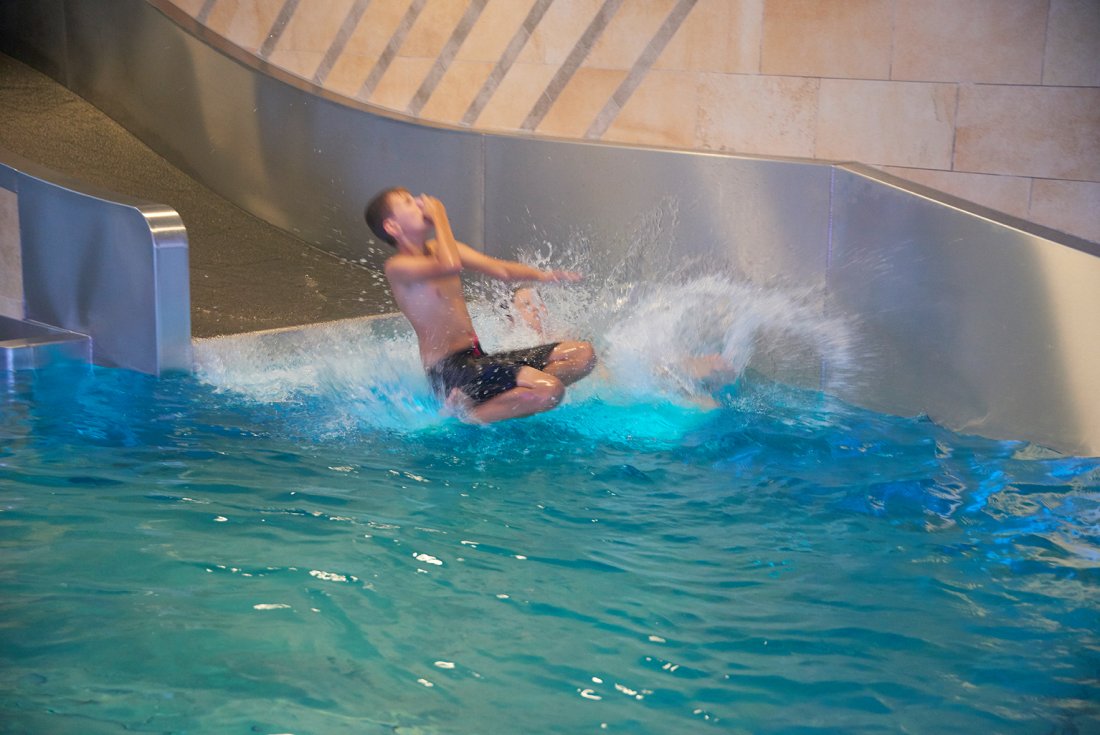 В обустроенном для игр крытом бассейне Splash Waterworld, площадью 100кв.м., детей и подростков ждет 48 метровая горка и множество других развлечений.