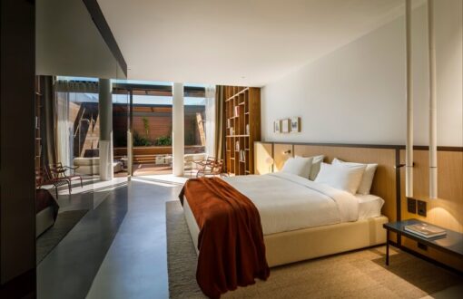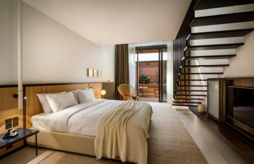 81 кв. метр, шикарные панорамные окна, выходящие в атриум. На верхнем уровне номера находится вход, гостевой туалет, lounge-зона и большой обеденный стол. На нижнем уровне расположена спальня, гардеробная комната площадью 9 кв. метров и ванная комната площадью 13 кв. метров. Из спальни можно выйти в открытый атриум с террасой, садом и частным бассейном. Вход во все номера Duplex Suites находится на 3 уровне отеля Grand Park Hotel Rovinj. Максимальное размещение – 3 человека.
