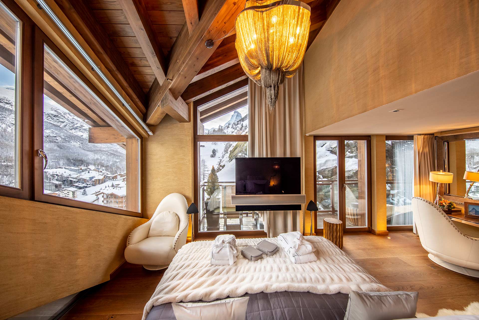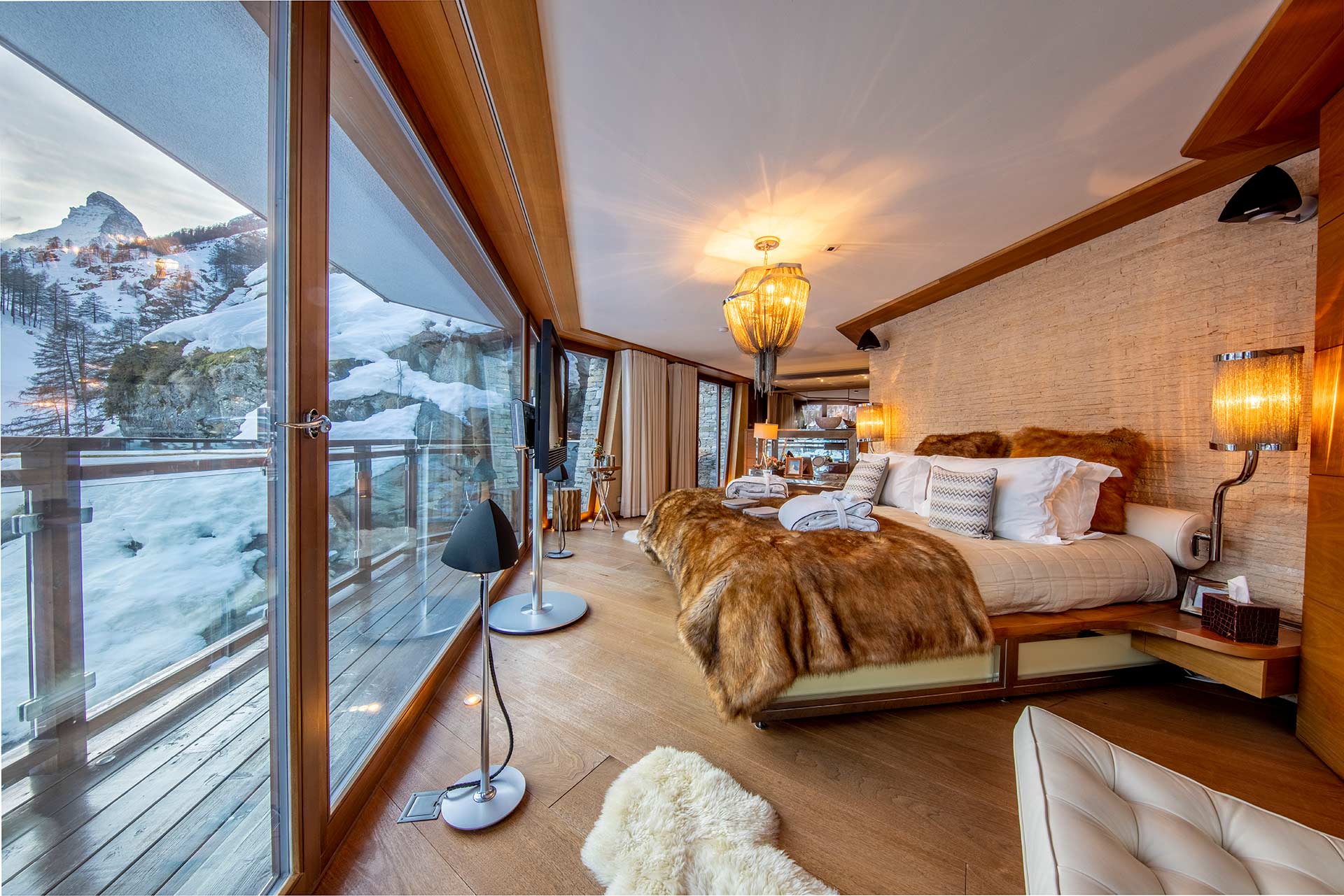 В этом шале днём или ночью можно любоваться великолепным видом на известную гору Маттерхорн и окружающие его вершины, очаровательную деревню Церматт и бескрайнее небо над головой.