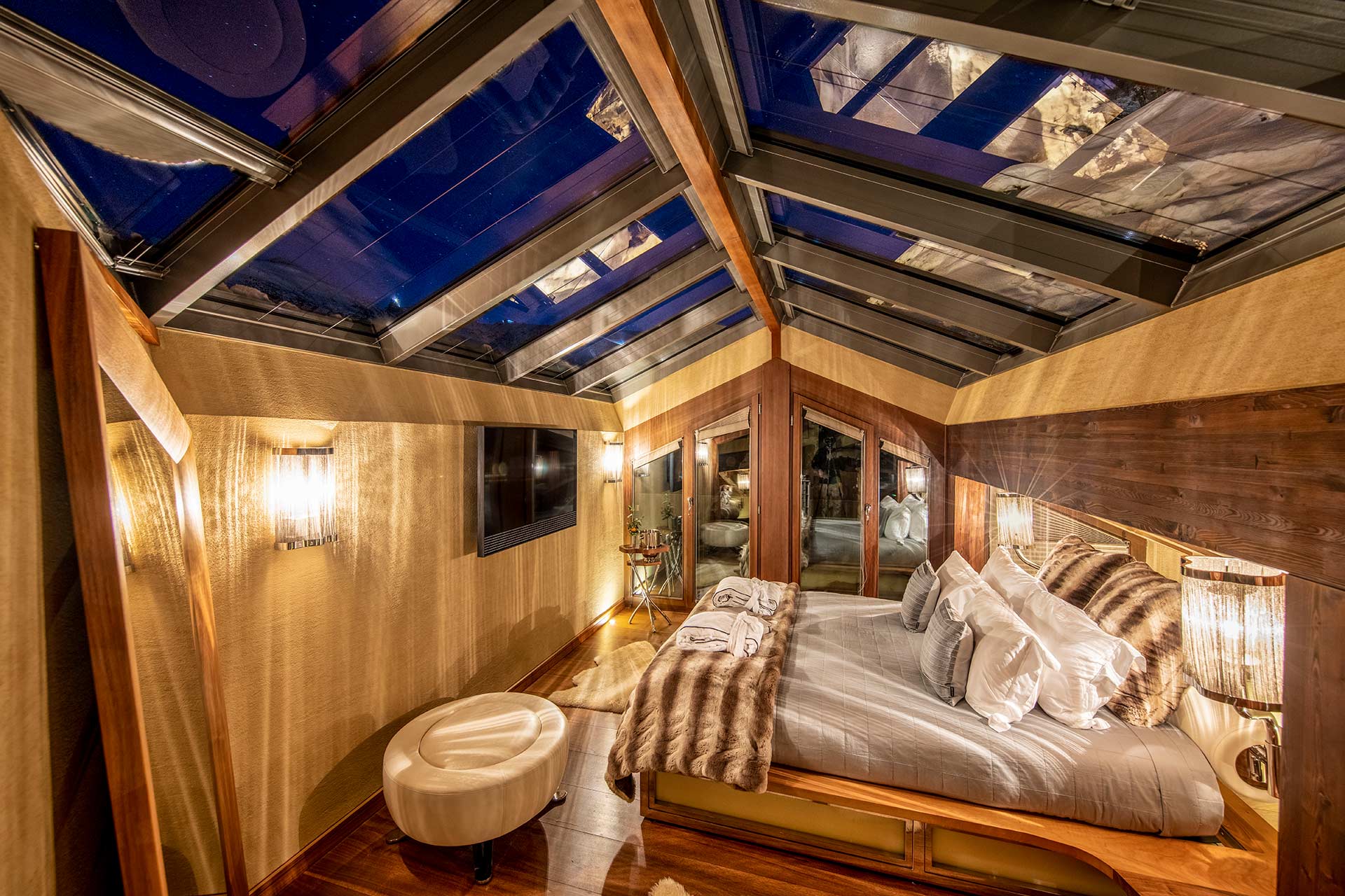 В шале 5 индивидуально оформленных дюплекс-спален-сьютов (double bedroom suites), все с пол-в-потолка окнами, собственными ванными комнатами (en suite), зонами для сна, отдыха и гардеробными.