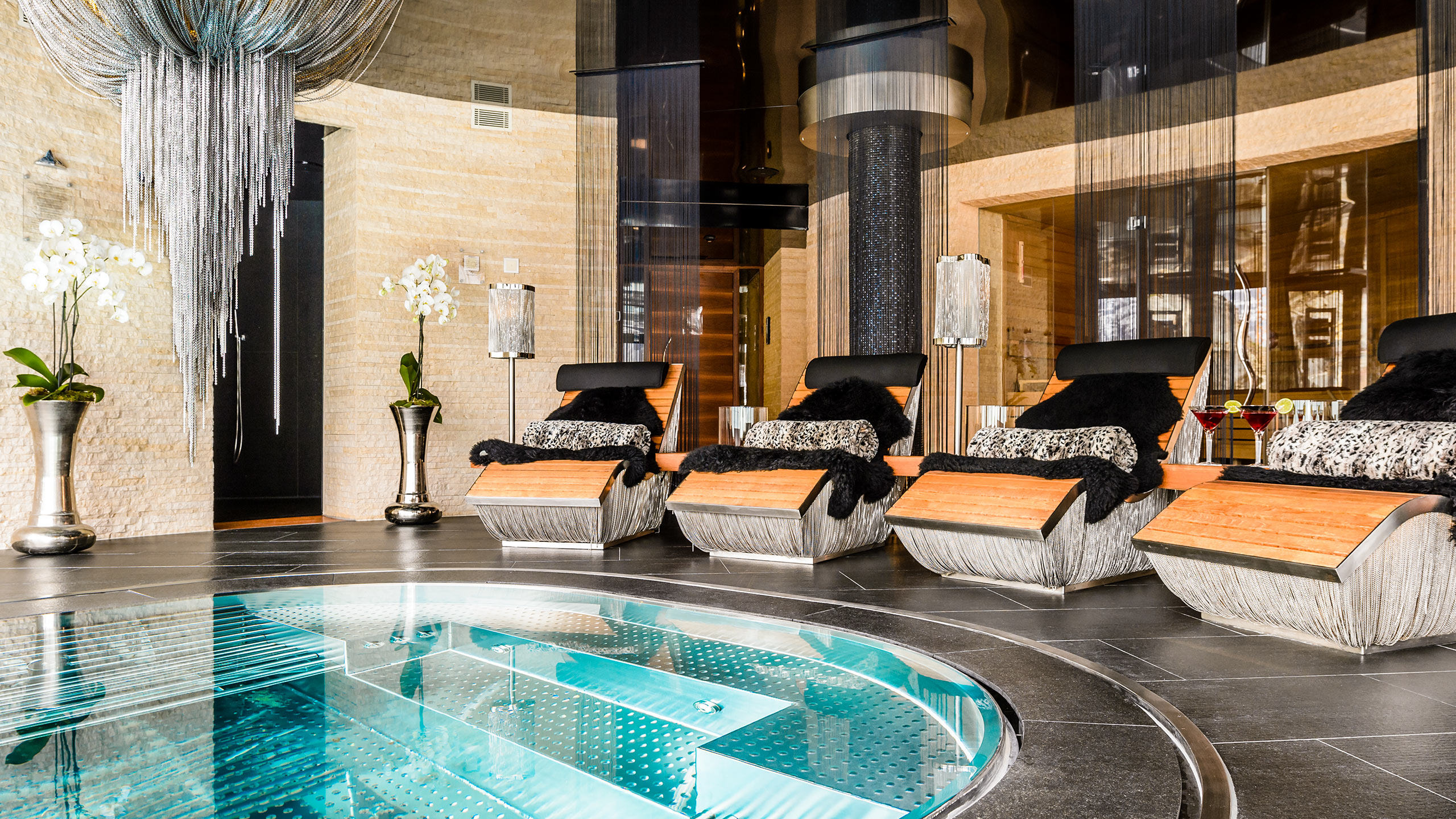 Общие жилые пространства открытой планировки, балконы, галёрейная зона, стеклянный крытый/открытый джакузи, лаунж-зона с видом, обеденная зона.