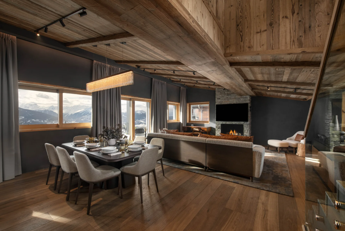 Номер в современном стиле с альпийскими мотивами, который идеально подходит для больших семей и групп, чтобы насладиться спокойной и просторной атмосферой.