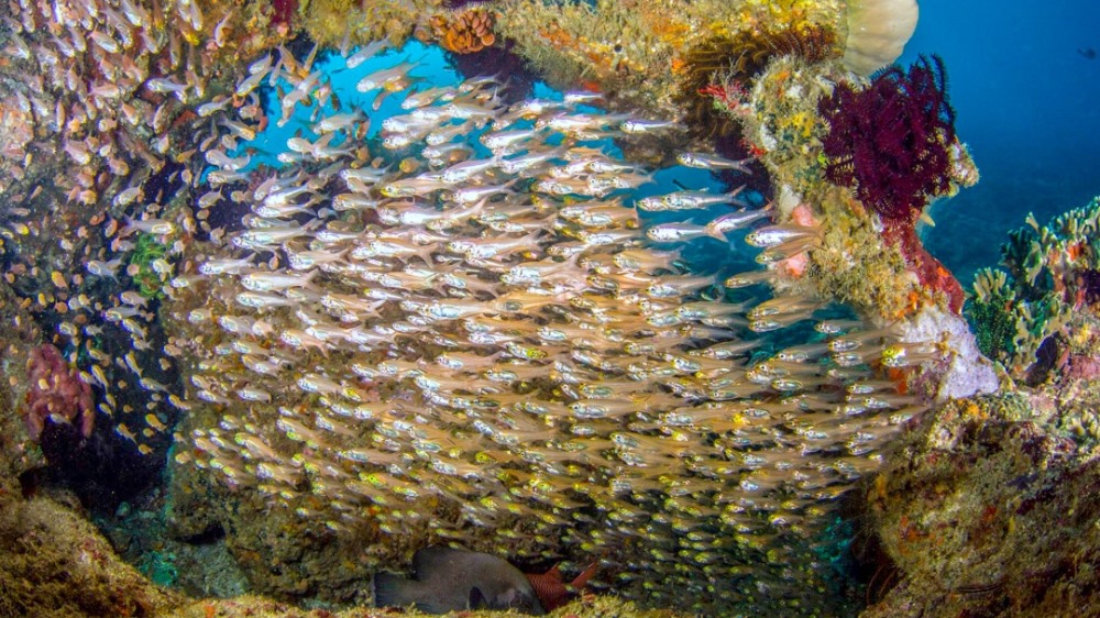 Подводный мир скалы Ришелье богат и красочен, но из-за сильных течений доступен только опытным дайверам. Помимо крупных обитателей морей, этот дайв-сайт знаменит огромными стаями из сотен и тысяч рыб самых разных видов, а также кораллами всех форм и расцветок. Встречи с китовыми акулами переполняют космическим восторгом: будто из синевы моря выплывает межпланетный корабль.