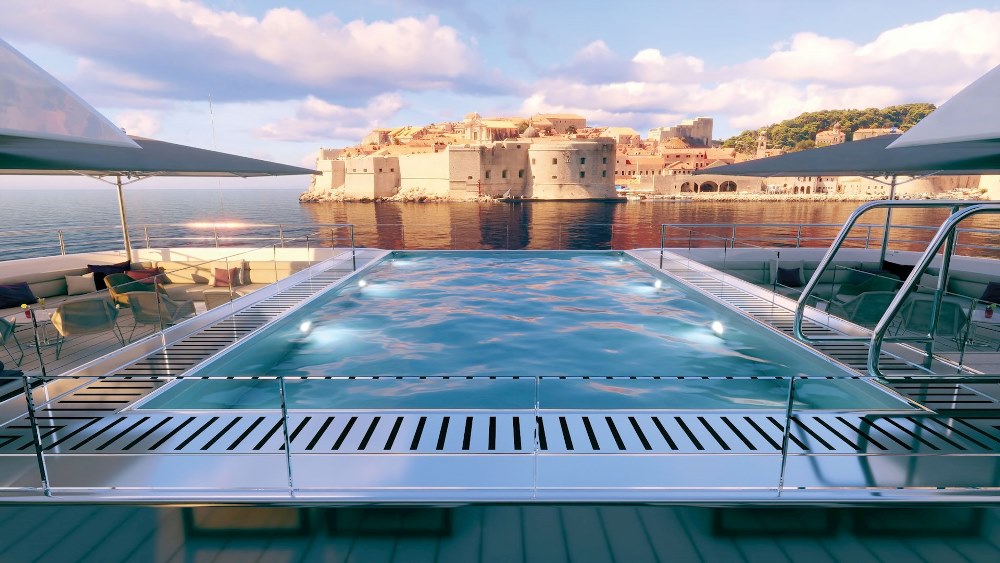 Суперъяхта предназначена для круизов в теплых морях, и на борту большое количество пространств для отдыха под открытым небом. Гости могут провести время в бассейне-инфинити или расположиться около него на шезлонгах под зонтиками и заказать напитки в находящемся здесь же баре. К услугам гостей элегантный лаундж-бар, обзорные площадки, спа-центр, сауна, тренажерный зал.