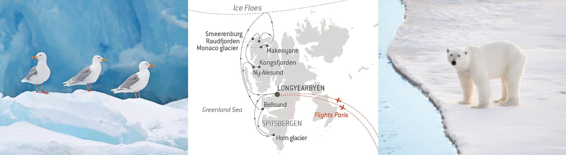 • Корабль будут сопровождать множество местных обитателей: арктические буревестники, чайки иарктические крачки.На борту корабля или в лодках вы будете восхищены мощью природы и одновременно осознаете ее хрупкость: огромные ледники или фьорды произведут невероятное впечатление!