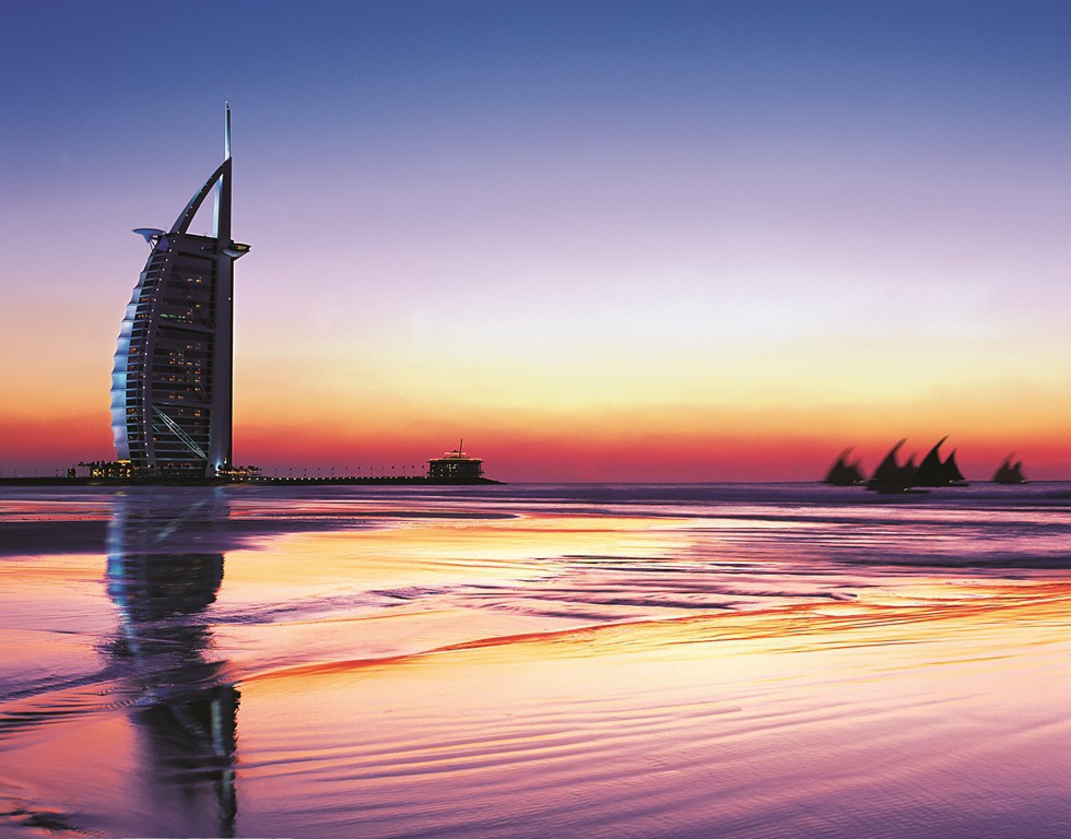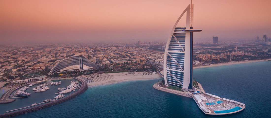 Всесвітньо відомий готель Burj Al Arab, який нагадує чудовий величезний корабель з білосніжним полотном, що майорить на південних вітрах, розташувався на відокремленому острові, насипаному у вигляді м'якого трикутника. Узбережжя Перської затоки у цій місцевості вкрите смарагдовими тропічними пейзажами. Цей красень висотою 300 метрів - одна з пам'яток Дубая, що найбільш запам'ятовуються.