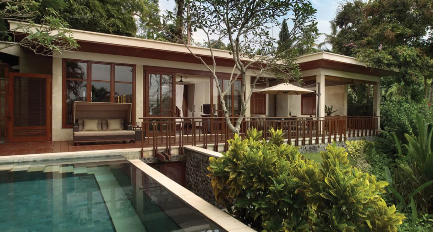 Sayan Villa: 1050 кв.м, розташована в усамітненому місці, на пагорбі, серед джунглів та ставків з лотосом, складається з вітальні з обідньою зоною на 6 осіб, спальні з ліжком під пологом, гардеробної, ванної кімнати з ванною та душем, душа на свіжому повітрі, просторої тераси з садом, власним басейном і зоною відпочинку. Максимальне розміщення – 3 дорослі або 2 дорослі + 1 дитина.