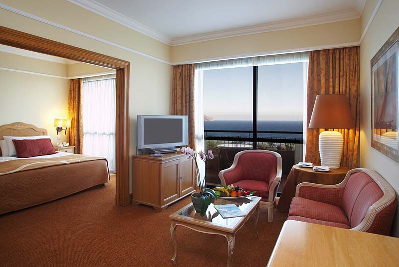 Полулюкс: - 112 кв.м1 часй З залу спальня з двома двоспальними ліжками, вітальня з обідньою зоною, ванна кімната з гарячою ванною, окремий душ і туалет, гостьовий номер.Ванна кімната, шафа, панорамний балкон на затоці Фуншалла. Три людини. Додаткові послуги надаються готелям.