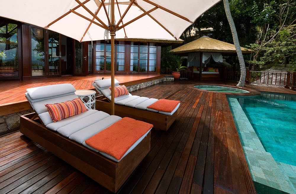 Private Pool Twin Residence: 570-700 м2, включає 2 спальні, 2 ванні кімнати, 3 душі на відкритому повітрі, вітальню, терасу з джакузі, обідньою зоною та басейном. Максимальне розміщення – 4 дорослих + 2 дитини.