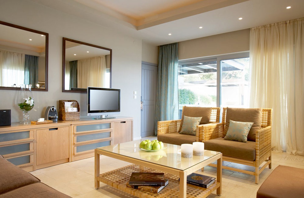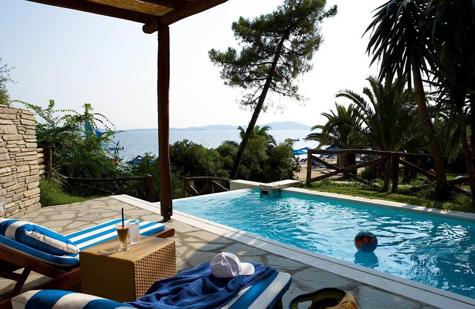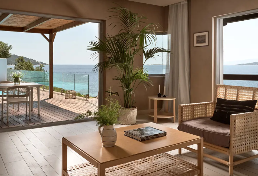 Ультрапросторе президентське бунгало на березі моря відоме як бунгало всіх бунгало на Халкідіках. Цей люкс площею 180 м² із приголомшливим видом на море з його заворожуючою блакитною водою пропонує все, а то й дещо. Окремий бар, велика оздоблена мармуром ванна кімната, гардеробна, приватний басейн і тераса – все це лише початок речей, яких варто очікувати, коли ви бронюєте це бунгало з трьома спальнями.