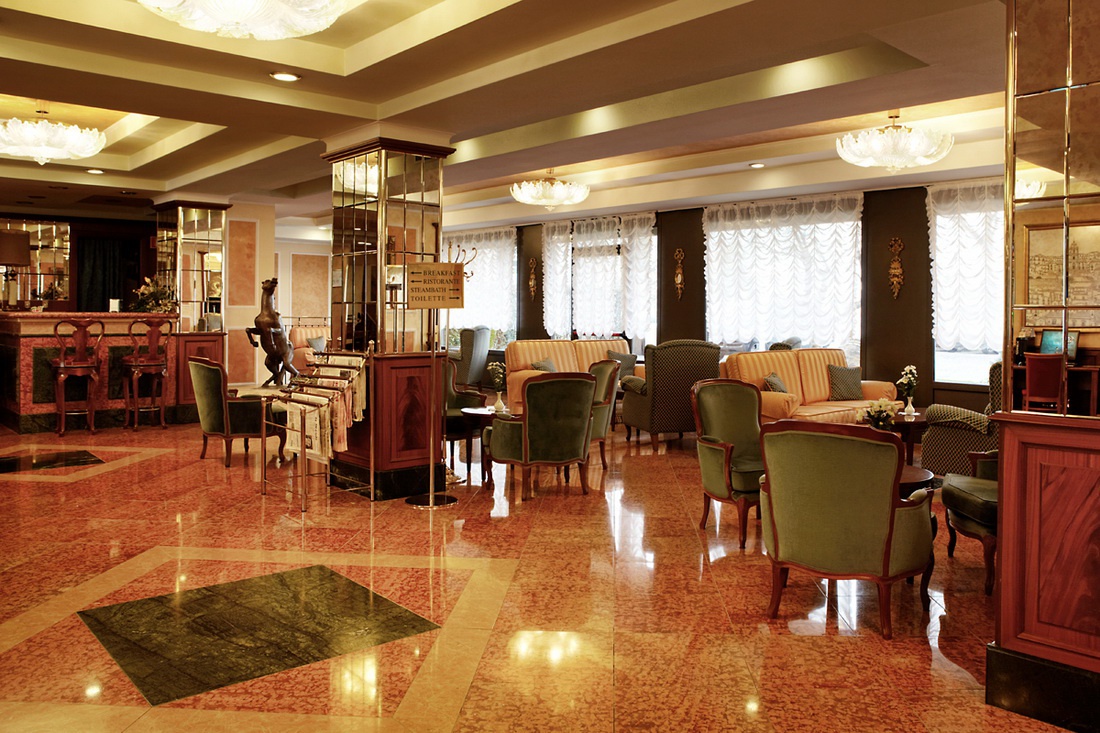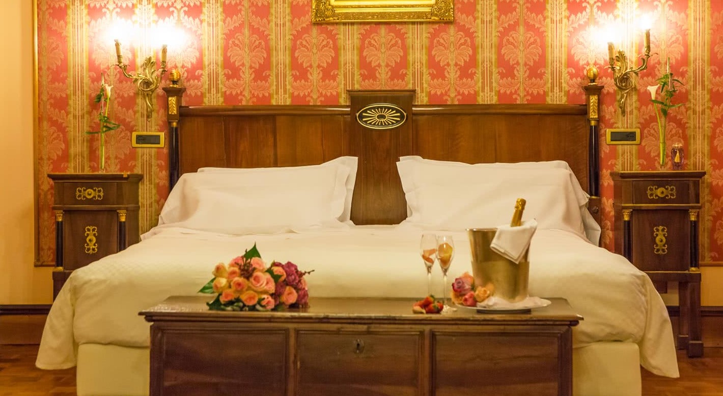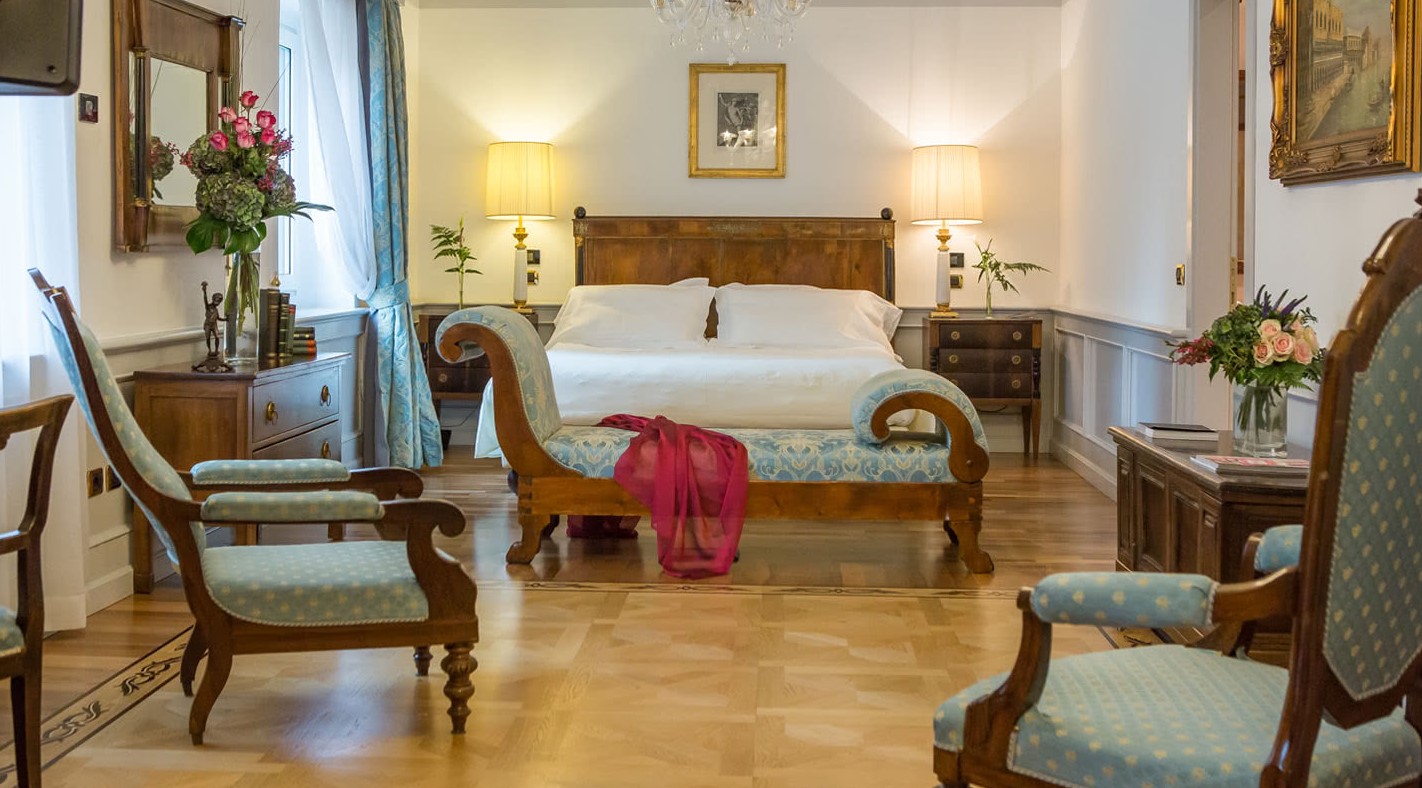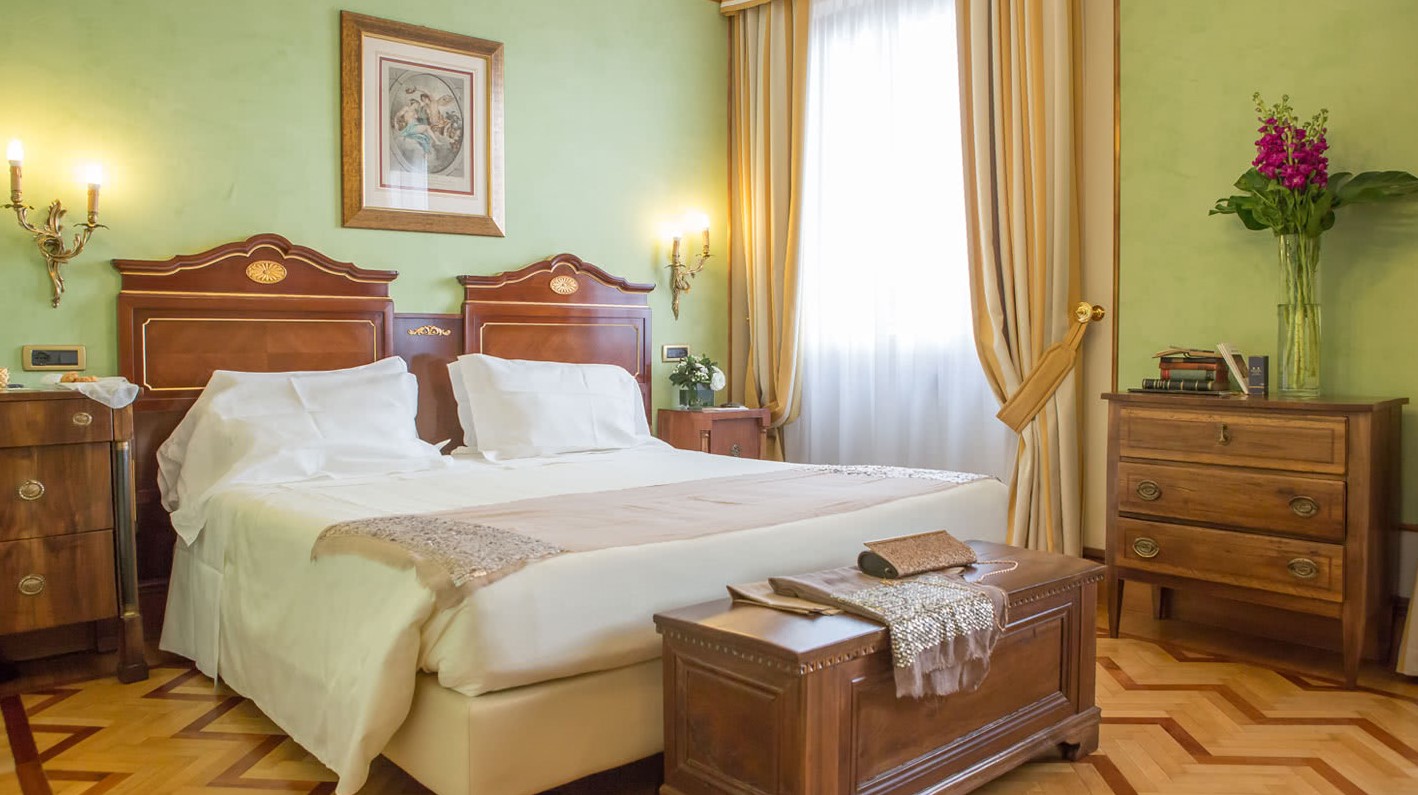 Усі номери Делюкс персоналізовані з особливою ретельністю та пристрастю до деталей. Повністю виготовлений вручну мармур теплих тонів, мозаїчні прикраси, дорогоцінний, вишуканий текстиль, оздоблення рідкісного престижу: деталі, створені для насолоди почуттів. Подорож крізь час та італійські традиції. Ванні кімнати, оздоблені рожевим мармуром, прикрашені мозаїчною мармуровою рамою великого дзеркала, оснащені ванною з душем.
