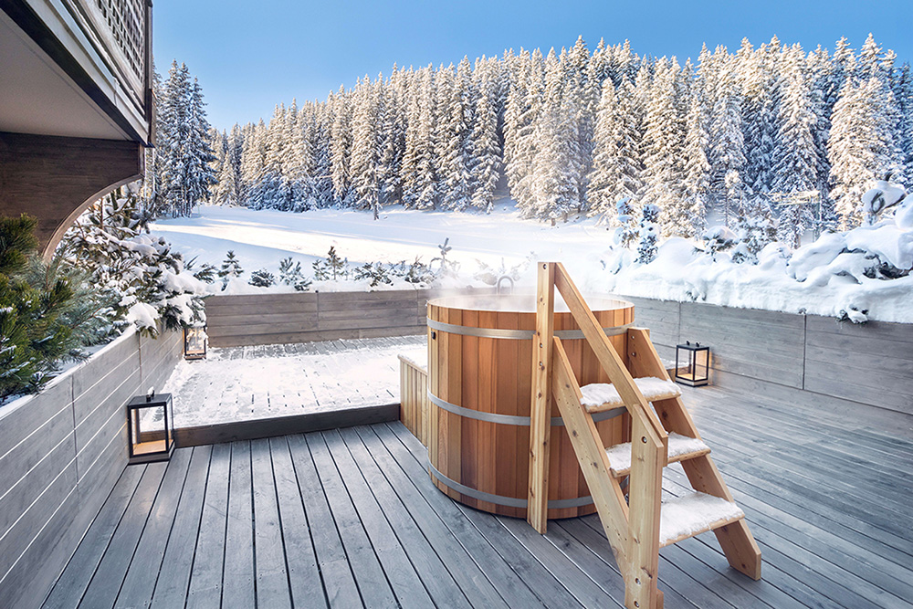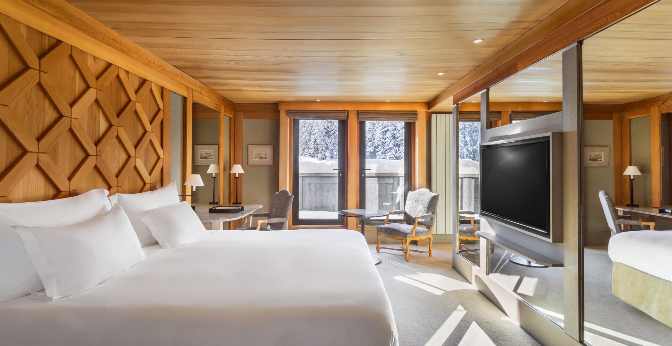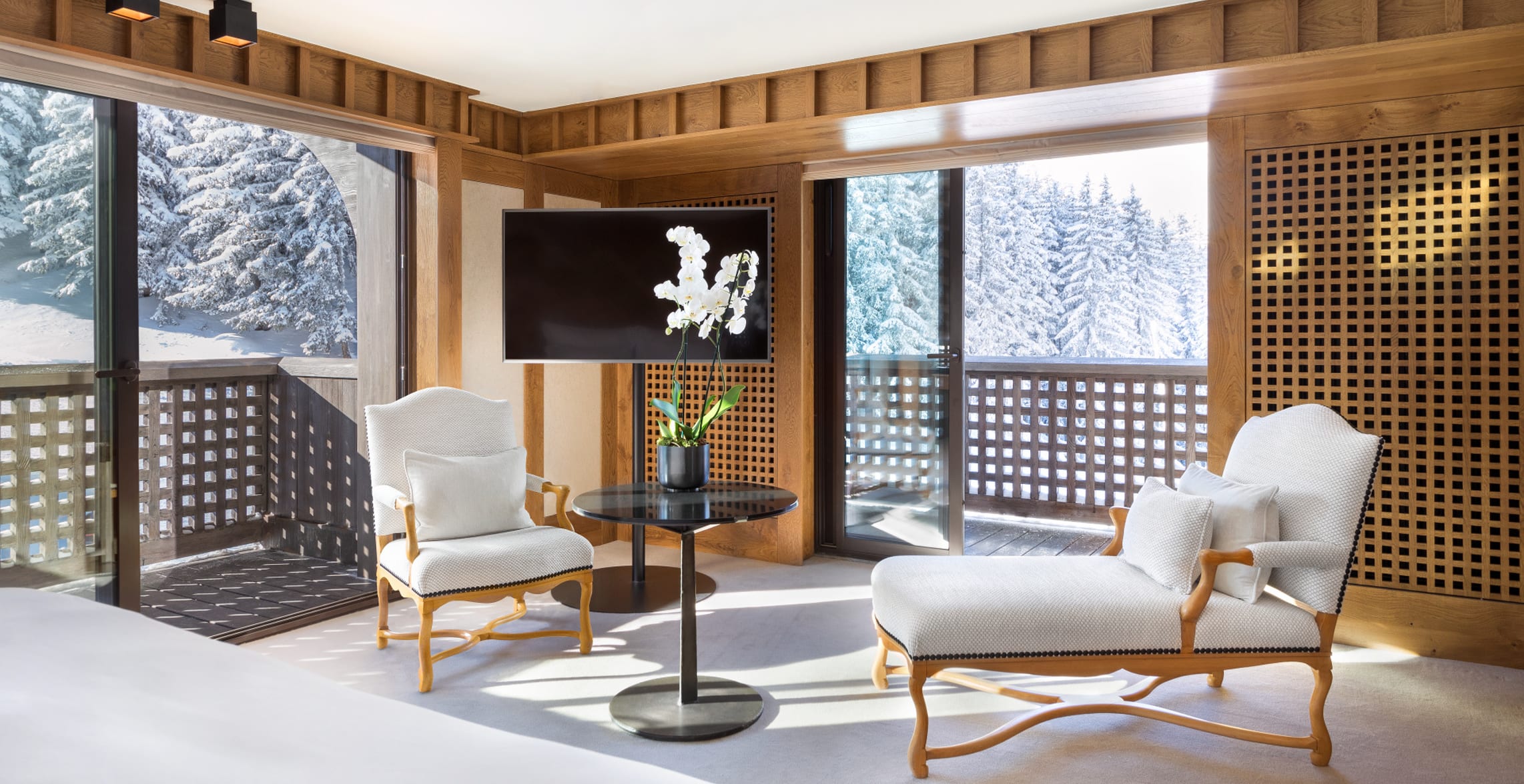 Aman Le Melezin пропонує гостям номери та люкси, з яких відкривається панорамний вид на засніжені вершини, що височіють на тлі чистого альпійського неба.