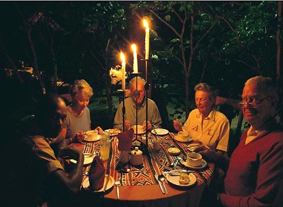 Різноманітні страви африканської кухні розміщують на великому загальному столі, або під дахом їдальні або під відкритим небом в дворі з відкритим вікном. Вечеря і вечеря може залежати від розкладу сафарі або сезону.