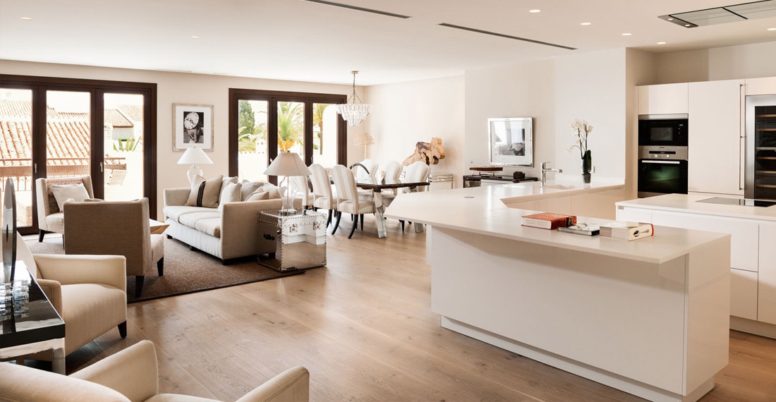 Вітальня з обідньою зоною та диванами з видом на пляж