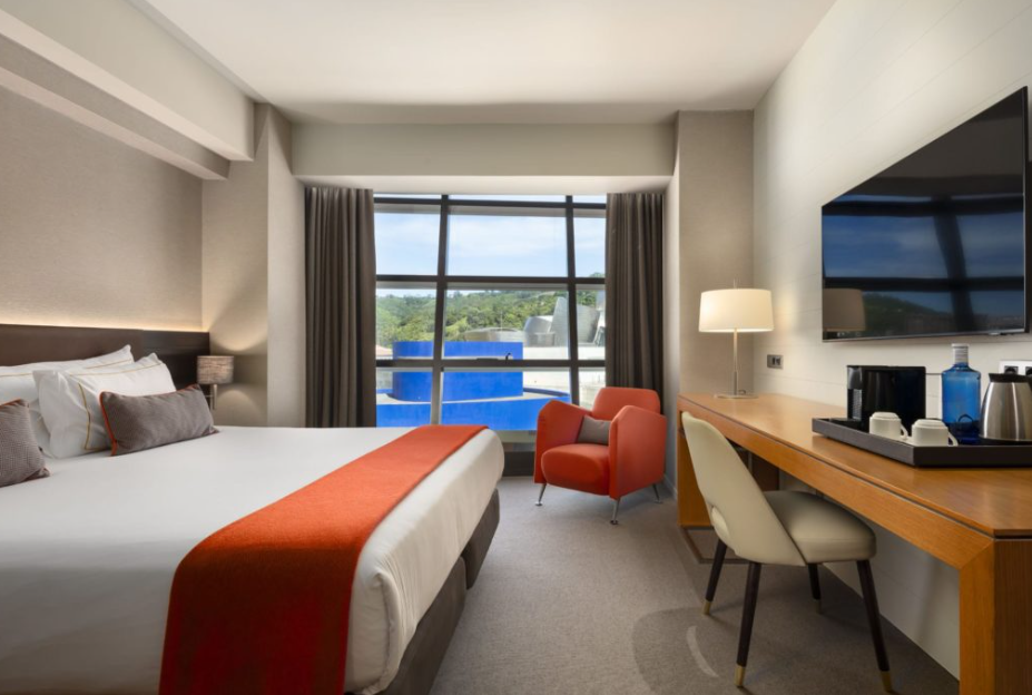 Просторі люкси, поділені на дві кімнати, дозволяють відпочити у затишній вітальні, розслабитися у вашій спальні або насолодитися нашою кухнею на ексклюзивній терасі з неперевершеним видом на музей Гуггенхайма.