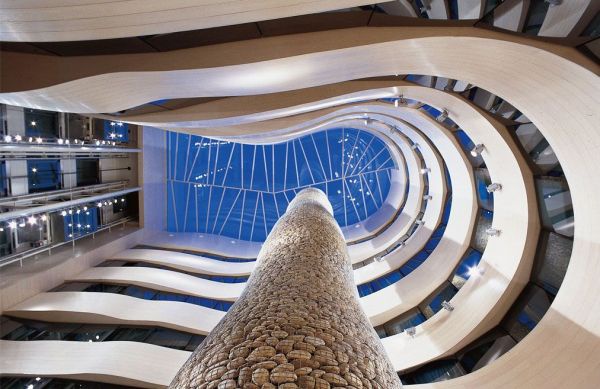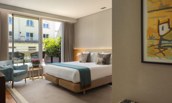 Теплий дизайн і зручність меблів роблять цей номер ідеальним вибором для відпочинку та бізнесу, насолоджуючись приголомшливим видом на кам’яний кипарис Хав’єра Маріскаля в атріумі готелю.