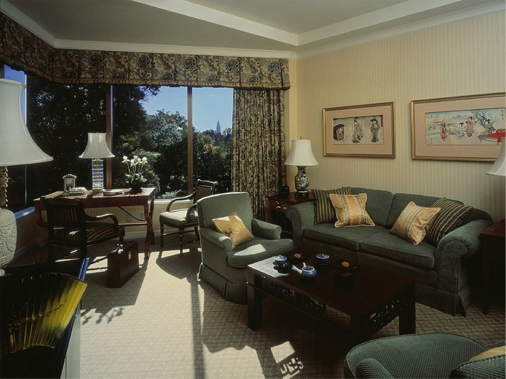 Посол Люкс: 138 кв.м1 часй Розташований на 14 поверсі, прикрашений зеленими тонами, в тому числі вітальними кімнатами з робочими та обідними зонами, двома спальнями з санвузлами, мають панорамний вид японського саду. Максимальне розміщення 6 дорослих або 4 дорослих +2 дітей.