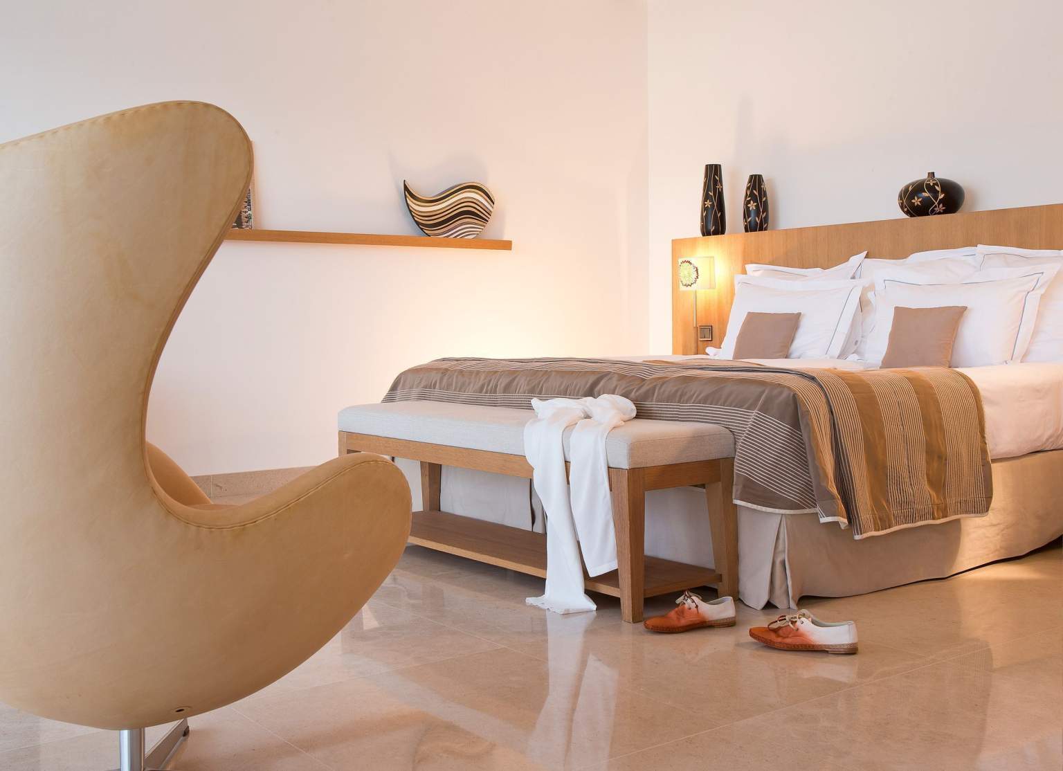 Світле дерево, білі стіни та сіра кам’яна підлога Bateig створюють яскраве, повітряне відчуття, яке задає тон кожному простору, відфільтроване та розсіяне м’якими завісами.