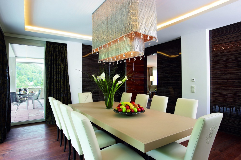 Пентхаус Люкс440 кв.м. На першому поверсі готелю знаходиться казковий номер відкритого типу. У спальні з великим ліжком з ергономічним повітряним люксом (також гостям пропонують ексклюзивні ліжка), зона відпочинку, шафа і телевізор, вид на альпію і навколишні пейзажі, гість з вогнем, фортепіано, меблевий апарат для BO, їдальня для 10 осіб.
