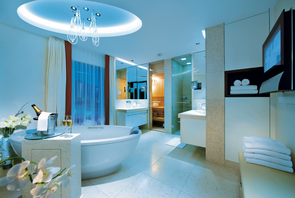 Спа-центр60 кв.м. Новий блискучий open-plane номер, виконаний в сучасному стилі дизайну, з деревними підлогами та шкіряними меблями, розташований від 1 до 4 поверхів. У комплекті спальні з великим ліжком з ергономічним повітряним люксом, зоною відпочинку з BO машиною, harbor, простою ванною кімнатою, відокремленою від спальні скляними дверима і збільшеною Swarovski запальницями, з джакузі, паровою кабіною, теплою водою і вікнами, від зон. У цій категорії є 12 саун. Можливий підключення до Junior Suite або наступного номера дверей Spa Loft.