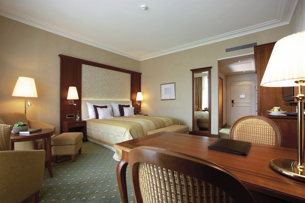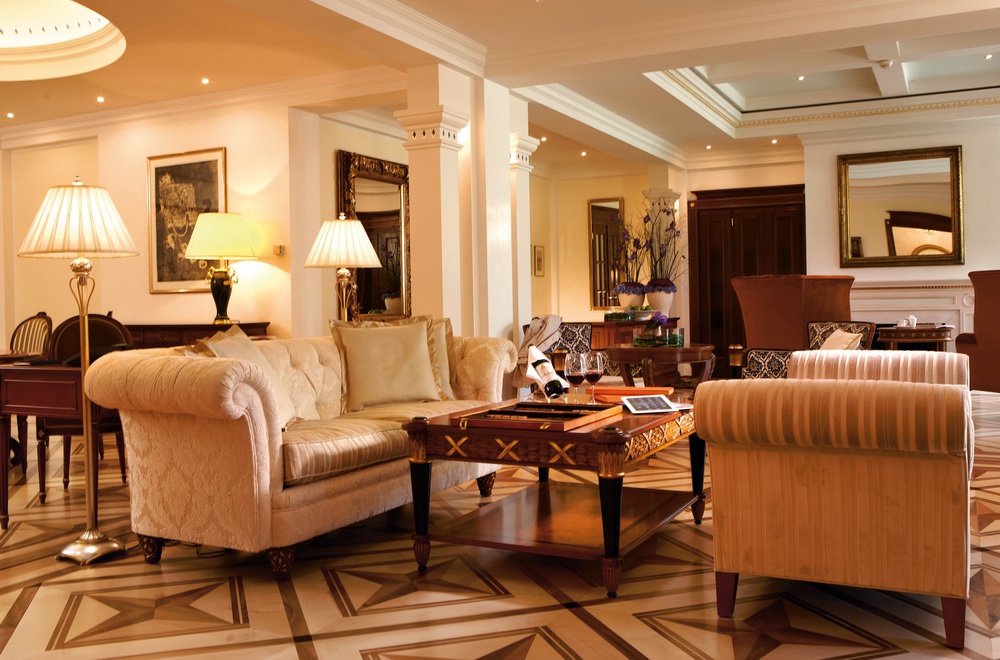 Полулюкс: 200 кв.м. Номер розкіш складається з фена, вітальні з фортепіано, вогнепальної зони, двох спальних кімнат з king-size ліжками, санвузлом, смугастим гранітом, з джакузі і теплою водою, гостьовим туалетом, великим балконом з видом на гори і гольф-поле. Половина вітальні затребувана парком. Може бути підключення до Junior Suite. Гості можуть скористатися послугами палацу.