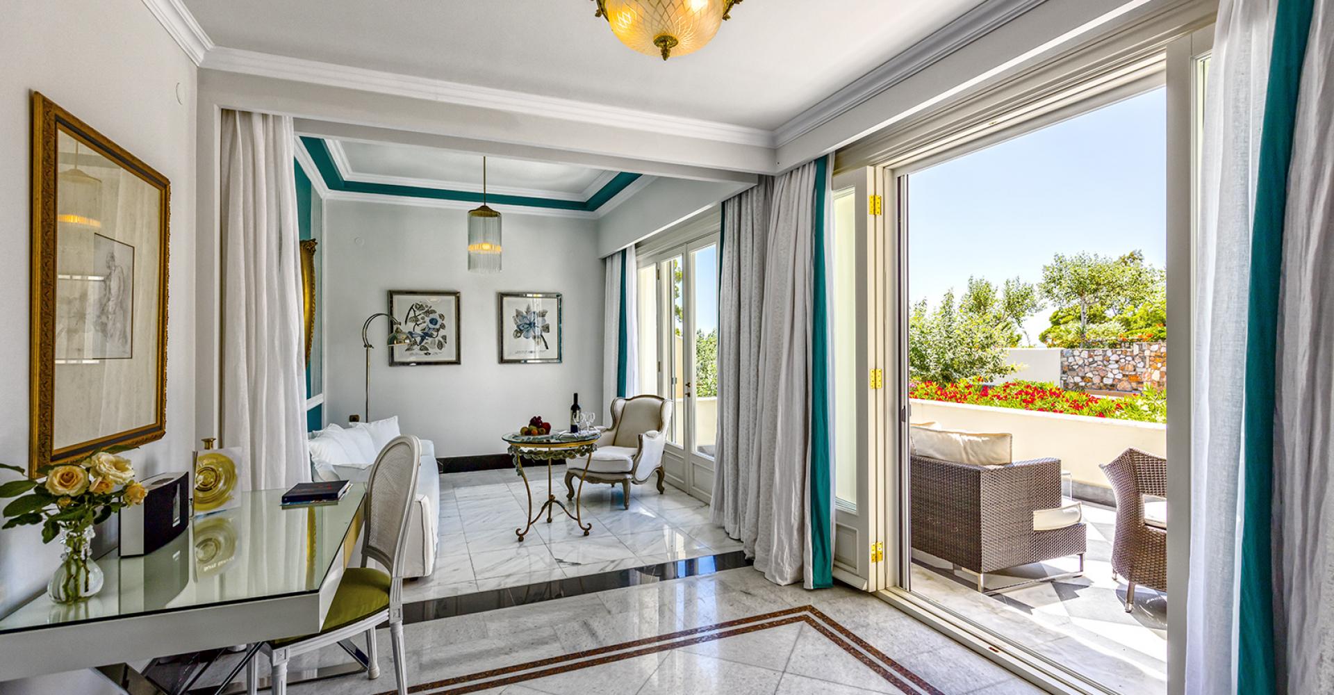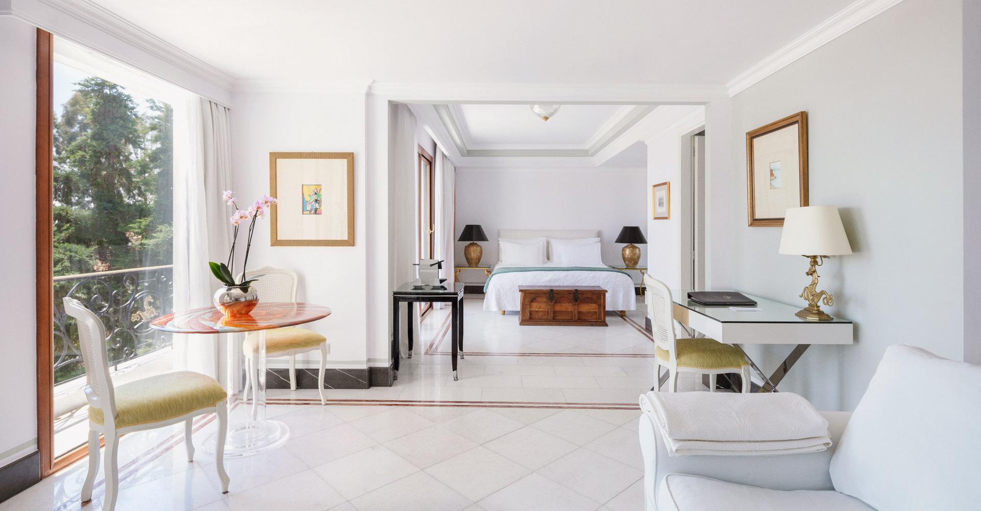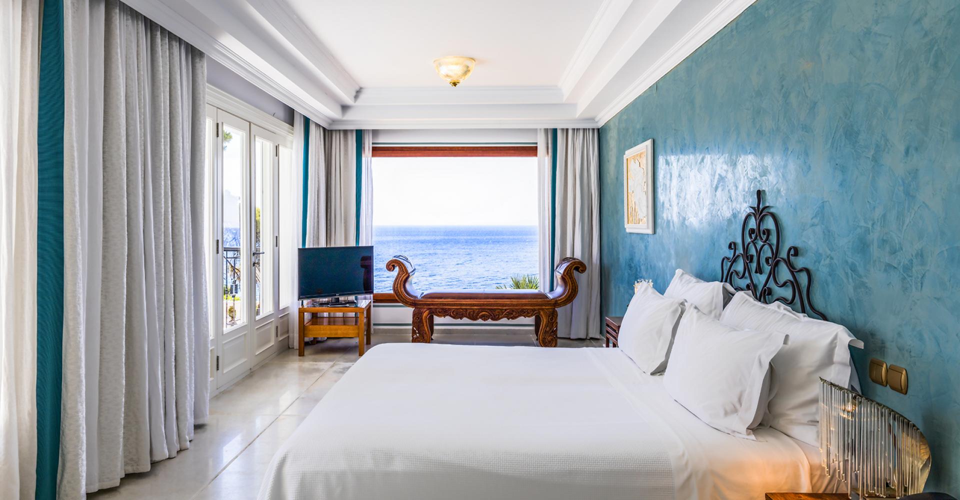 190 кв. м. Розкішний номер з вікнами від підлоги до стелі та панорамним видом на море складається зі спальні, розташованої на піднесенні, вітальні з антикварними меблями, мармуровою підлогою та гарним каміном. З величезної мармурової ванної кімнати відкривається чудовий краєвид на Середземне море, кімната обладнана гідромасажною ванною-джакузі та окремим душем, у номері є додаткова ванна кімната та величезний мебльований балкон. Розміщення: 4 особи.