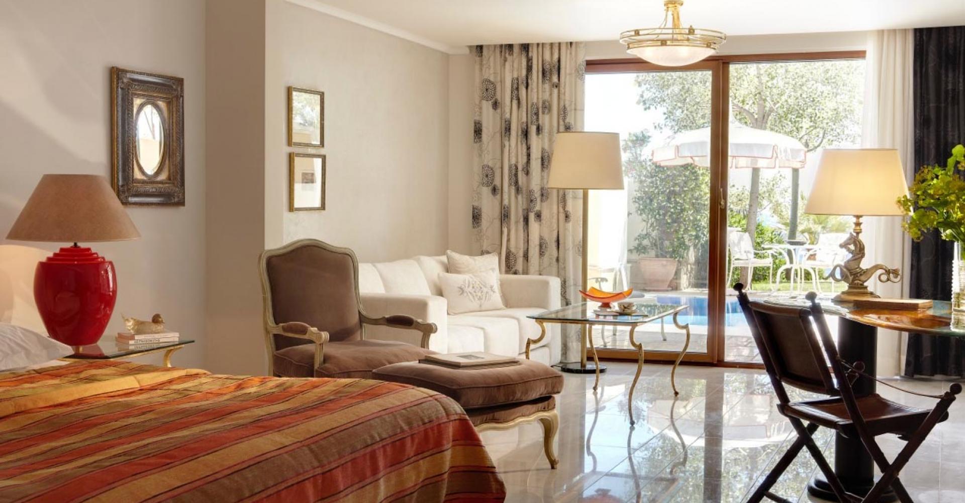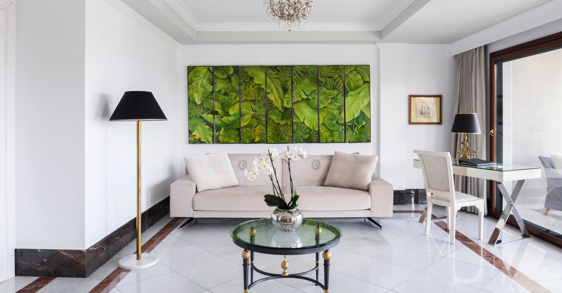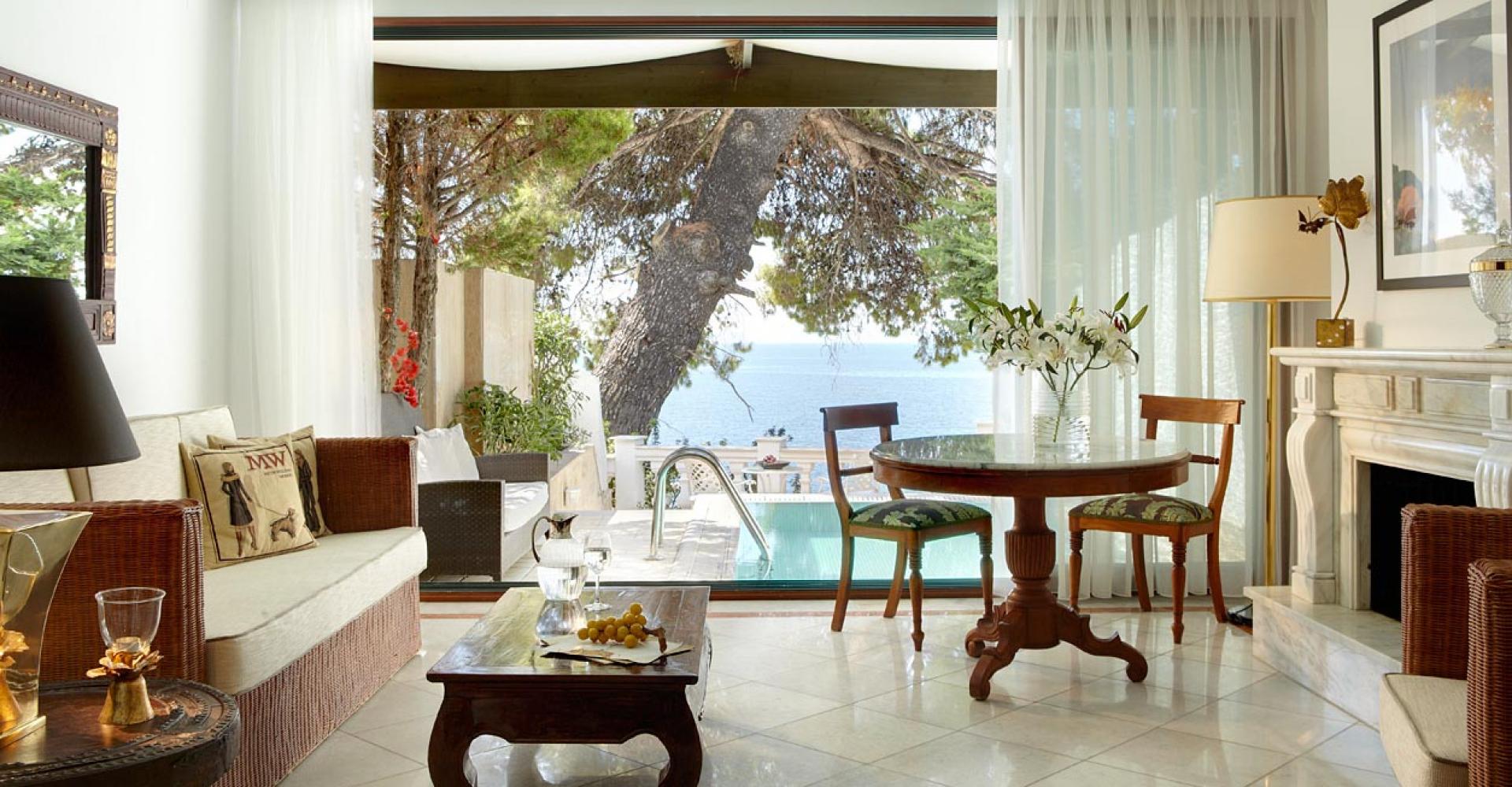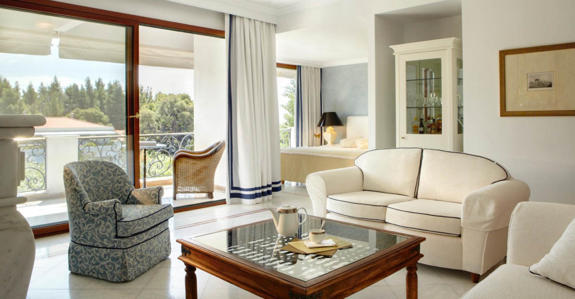 190 кв. м. Розкішний номер з вікнами від підлоги до стелі та панорамним видом на море складається зі спальні, розташованої на піднесенні, вітальні з антикварними меблями, мармуровою підлогою та гарним каміном. З величезної мармурової ванної кімнати відкривається чудовий краєвид на Середземне море, кімната обладнана гідромасажною ванною-джакузі та окремим душем, у номері є додаткова ванна кімната та величезний мебльований балкон. Розміщення: 4 особи.