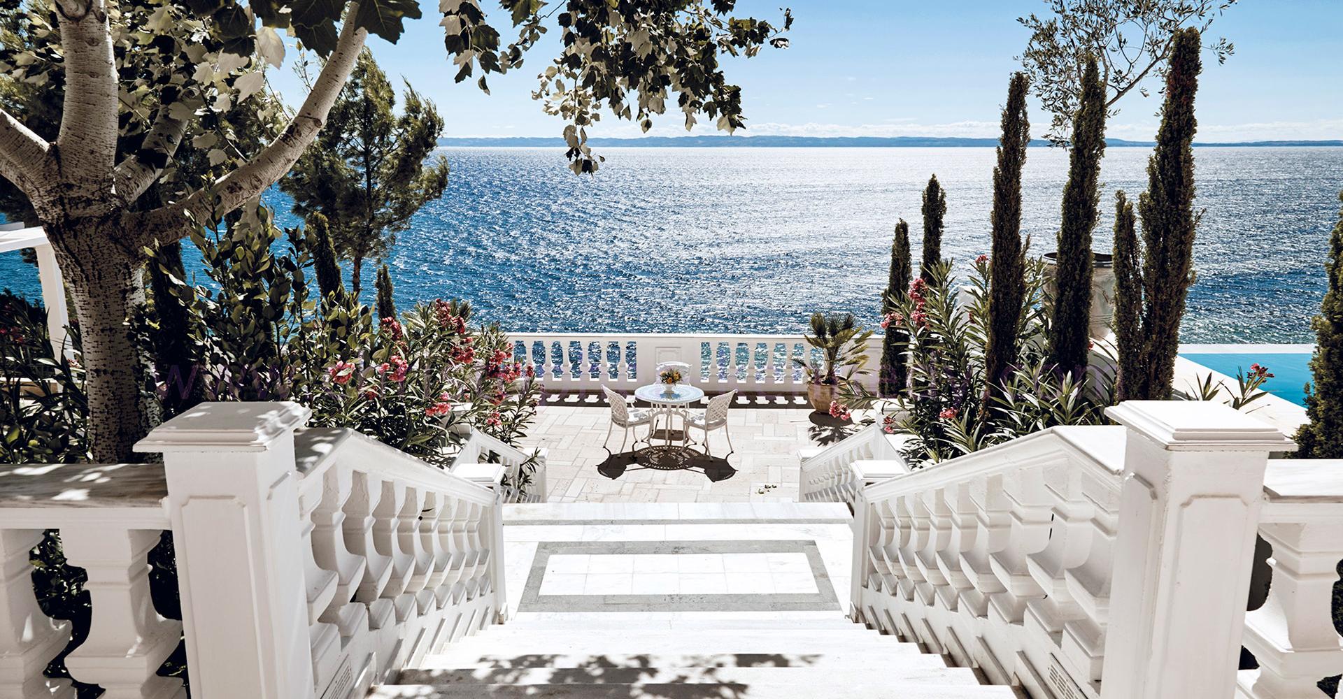 450 кв. м. Шикарна дворівнева вілла з басейном розташована на території гарного саду площею 700 кв. м, де ростуть лимонні та апельсинові дерева. Вілла оточена віковими соснами і знаходиться на височині з якої відкривається приголомшливий вид на блакитні води. Включає три спальні, дві мармурові ванні кімнати, два додаткові туалети, величезну вітальню зі своїм баром і каміном, кухню, велнес-зону з масажним ліжком. Дах вітальні відкривається, щоб гості могли милуватися зоряним небом. Розміщення: 6 осіб.
