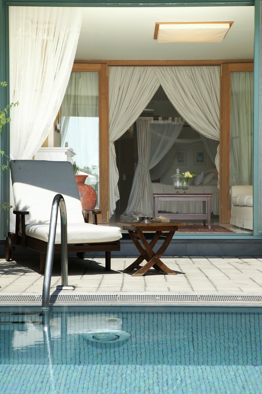 55-60 кв. м. Романтичний люкс складається зі спальні з великим двоспальним ліжком, зони відпочинку, яка відокремлена від тераси скляною стіною, ванної кімнати з ванною та душем. З просторої мебльованої тераси з басейном, що підігрівається, відкривається вид на маленький приватний садок і море. Розміщення: 2 особи.