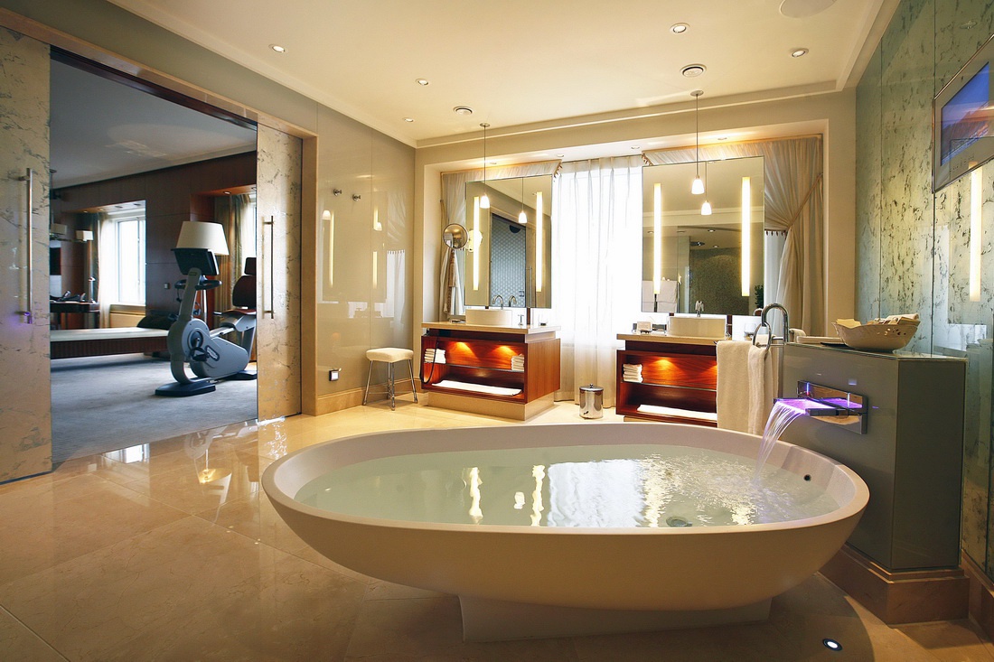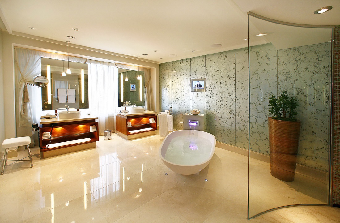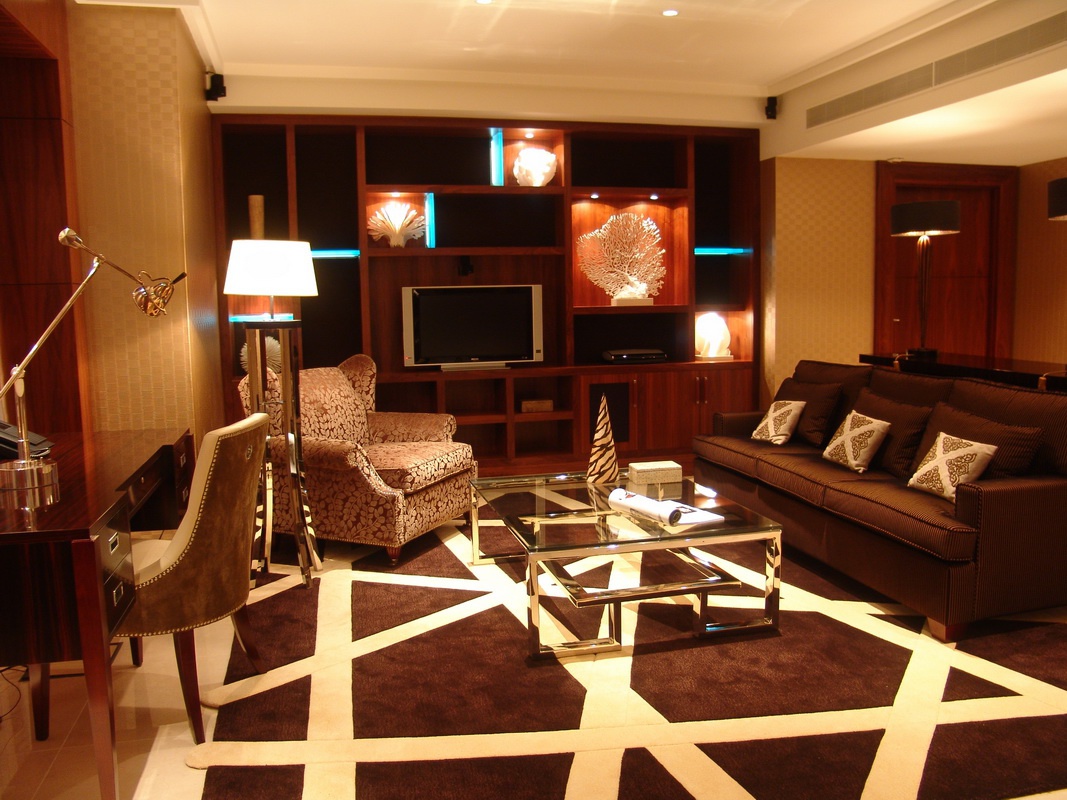 Люкс: 485 кв.м1 час♪ Розташований на 18-19 поверхах; з панорамним видом на місто; він складається з двох спалень, двох номерів, двох гостьових номерів, тренажерний зал, кінотеатр, їдальні. Шовкові стіни, мармурові поли, чудові килими та меблі в шоколадних тонах створюють нескінченну атмосферу розкоші. На першому поверсі знаходиться водооптичний люстра довжиною 3,5 метрів. М'ячі хромовані опорні дії скляної сходи, яка освітлюється світильниками.