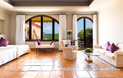 95 кв. м. Прекрасний люкс з видом на гори та море складається зі спальні відкритого плану з двома двоспальними ліжками, яка знаходиться на невеликому піднесенні відносно затишної вітальні, ванної кімнати з джакузі та душем, двох терас загальною площею 20 кв. м та просторого солярію.
