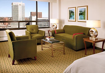 23-поверховий Calgary Marriottt розташований в центрі Калгарської вежі, навпроти Calgary Stampede, Pengrowth Saddledome і інших особливостей міста. У комфортабельних номерах вишукані класичні інтер'єри в теплих тонах, ковролін на підлозі, елегантні меблі, ретельно підібрані декоратори, великі, з підлоги до стелі, вікна з чудовим видом на місто і навколишнім його пейзажами. У готелі є оздоровчий центр, в тому числі покрівельний басейн, джакузі, тренажерний зал.