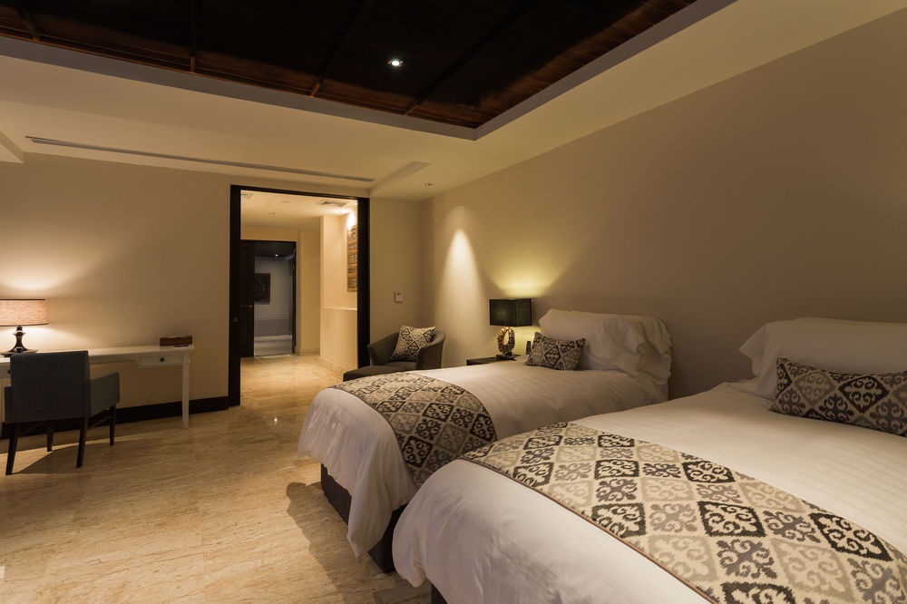 4 Спальня Ocean Front Residence: - 1000 м1 часй Гостинна вілла над пляжем, складається з декількох павільйонів, включає в себе житлові та обідні зони, кухню, чотири спальні (два з king-size ліжками і два з двома односпальними ліжками) з санвузлом, тераса з 20-метровим басейном і зон відпочинку. Максимальне розміщення 12 дорослих або 8 дорослих + 4 дітей.