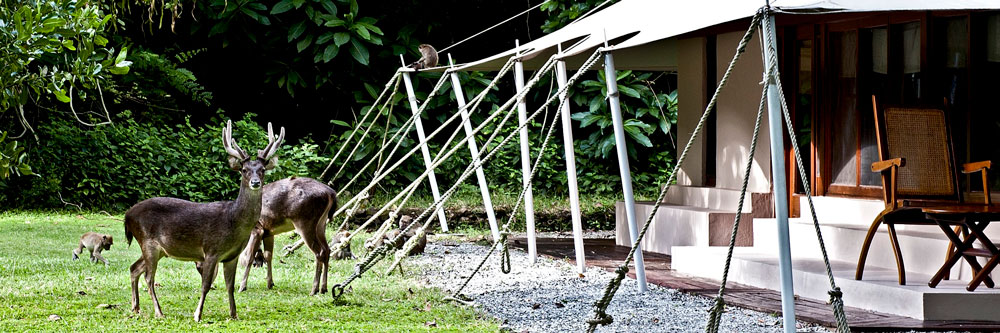 Серед незайманих джунглів невеликого острова Мойо, де мешкають олені і дикі кабани, мавпи і морські орли, де шумлять прохолодні водоспади, а кристально чисті води моря Флорес рясніють підводною фауною, в мальовничій бухті з білосніжним пляжем розташувався Amanwana, що включає лише 20 бунгало і виконаний у стилі наметового містечка. У просторих комфортабельних номерах – затишні інтер'єри, з дерев'яними підлогами, зручними меблями, прикрасами роботи індонезійських майстрів, терасами, оточеними пишною тропічною зеленню, що виходять на блакитну затоку Amanwana.