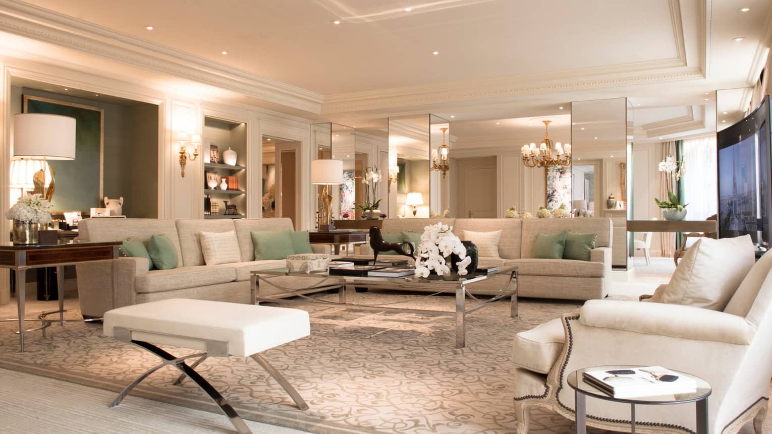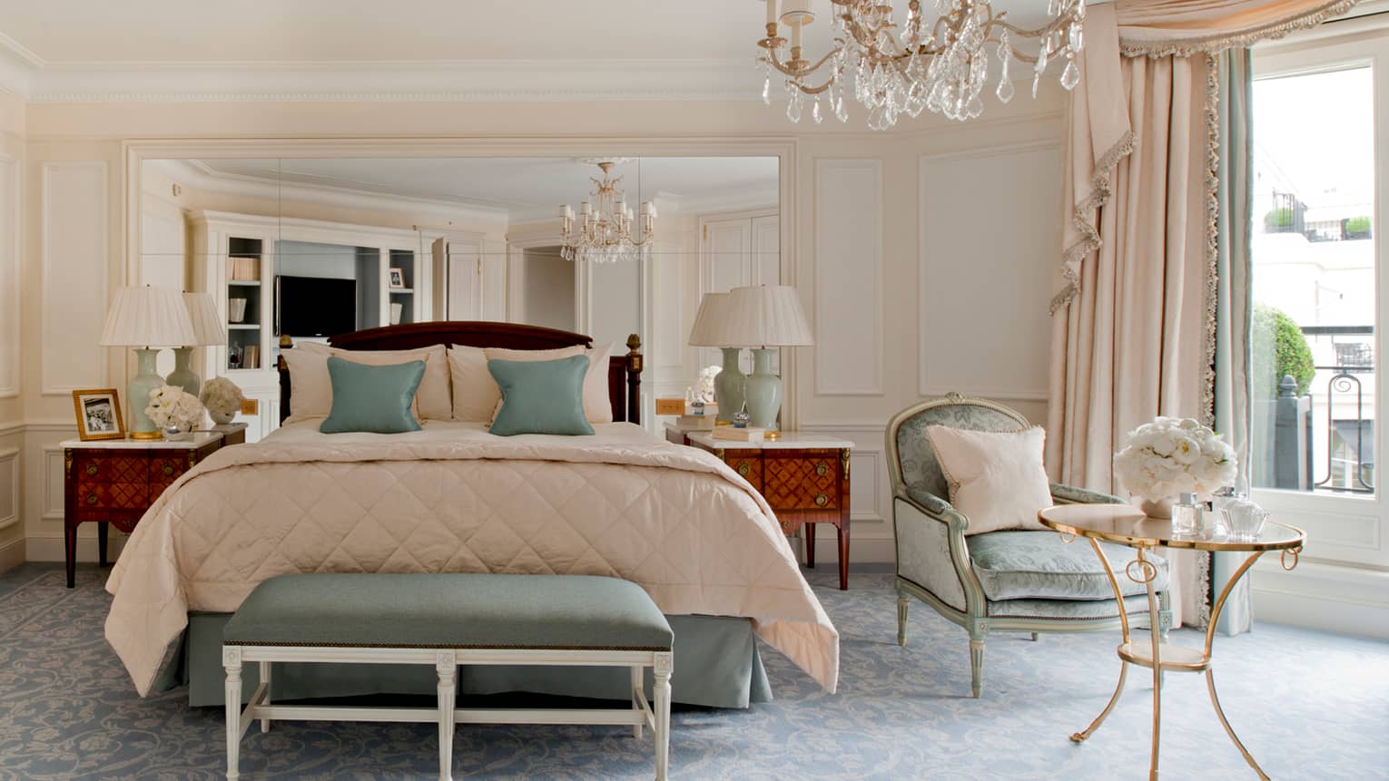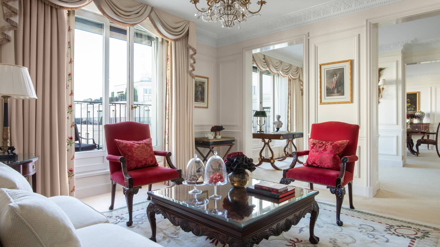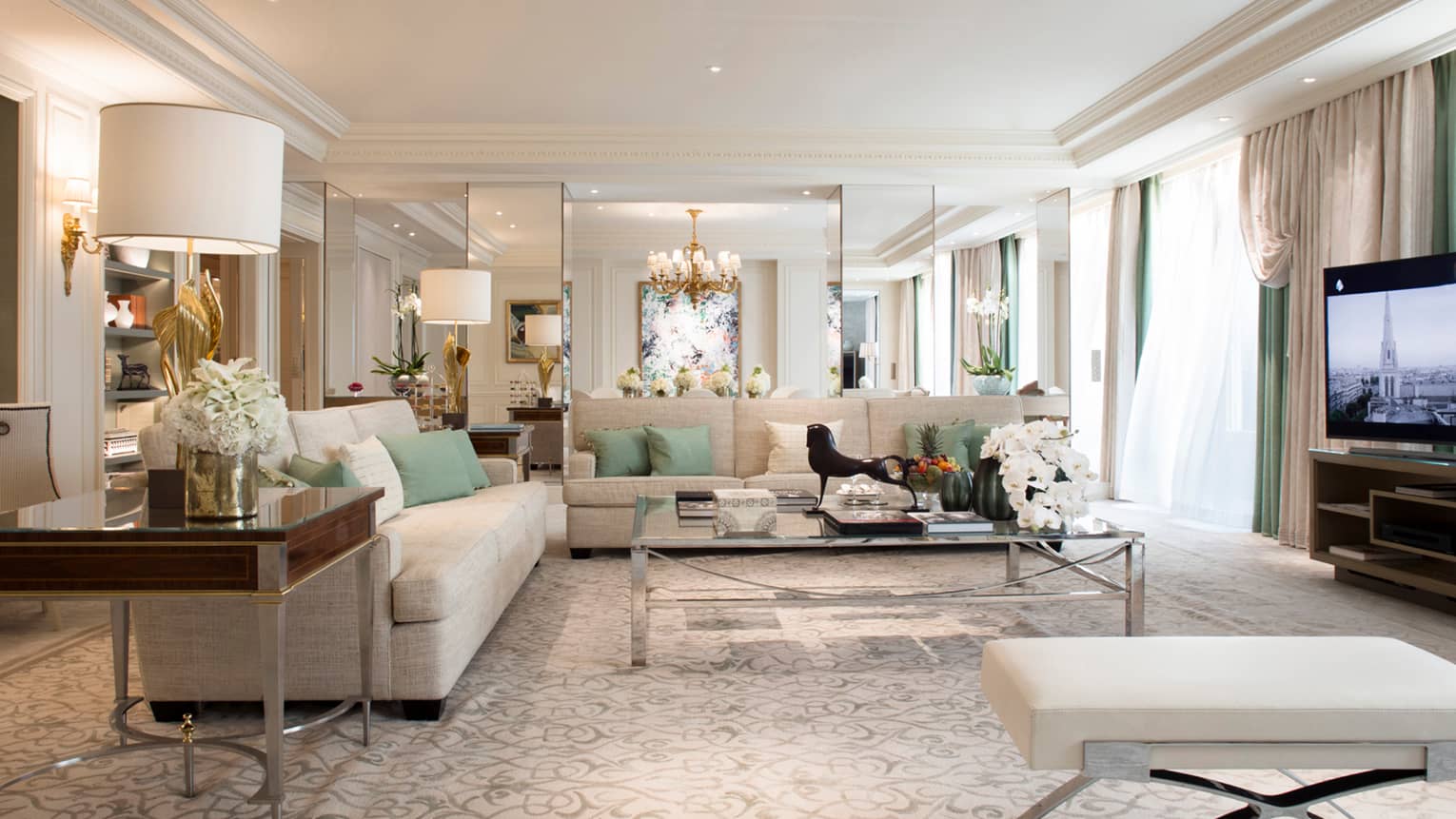 140 кв. м. Стильний люкс розташований на 4-му поверсі і складається з 1-ї або 2-х спалень, просторої вітальні, гардеробної, 1-ї або 2-х мармурових ванних кімнат з ванною та окремою душовою кабіною, гостьового туалету, повністю обладнаної кухні, мебльованого балкону. З номера відкривається чудовий краєвид на Avenue George V і Мармуровий двір. Максимальне розміщення: 4 дорослих або 2 дорослих та 2 дітей.