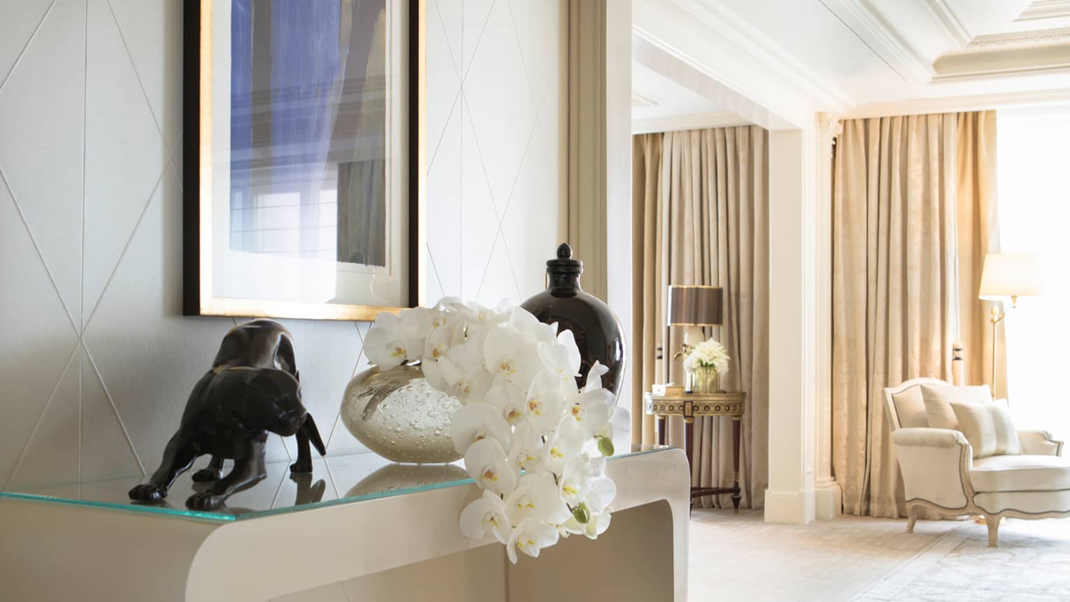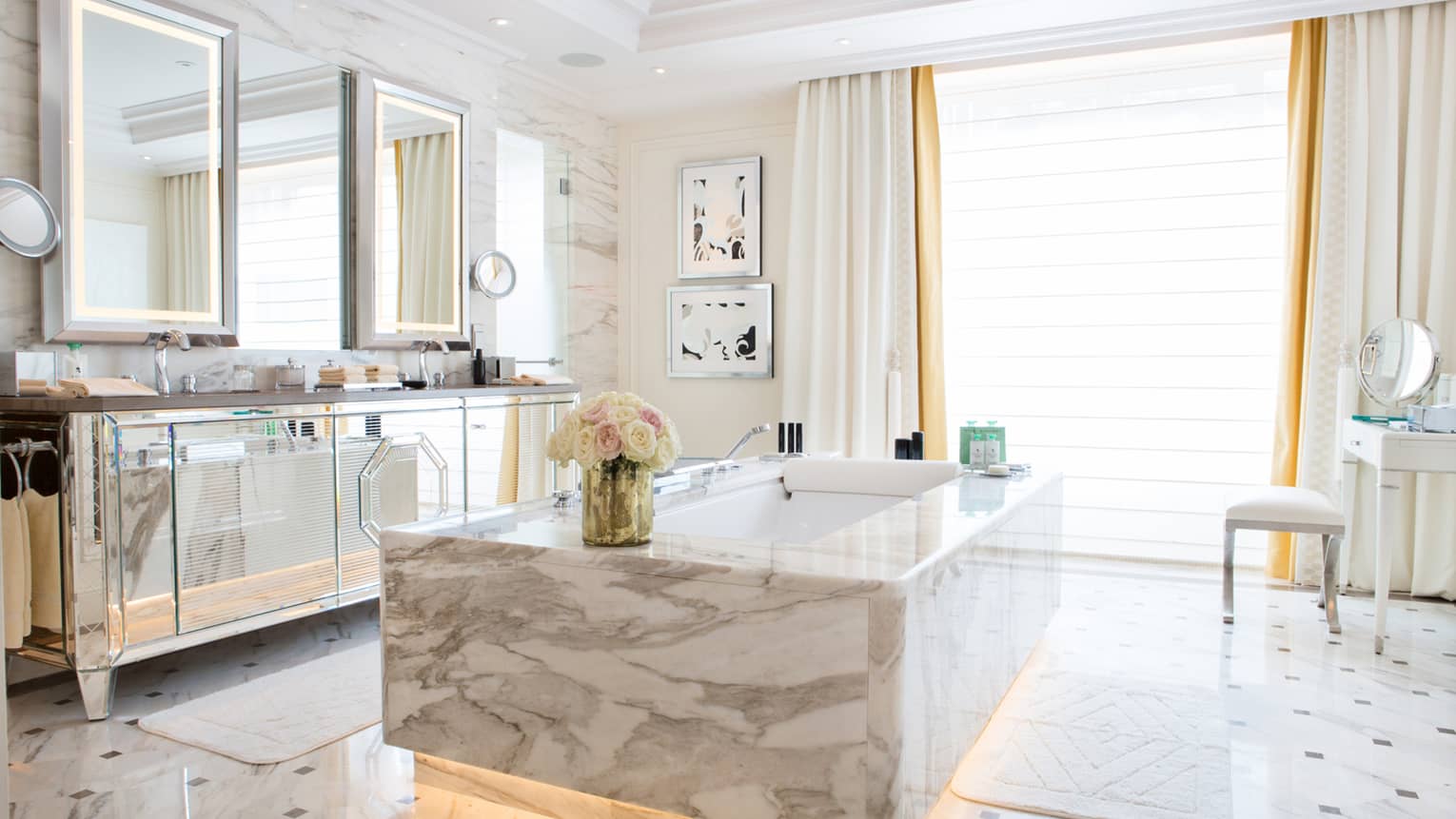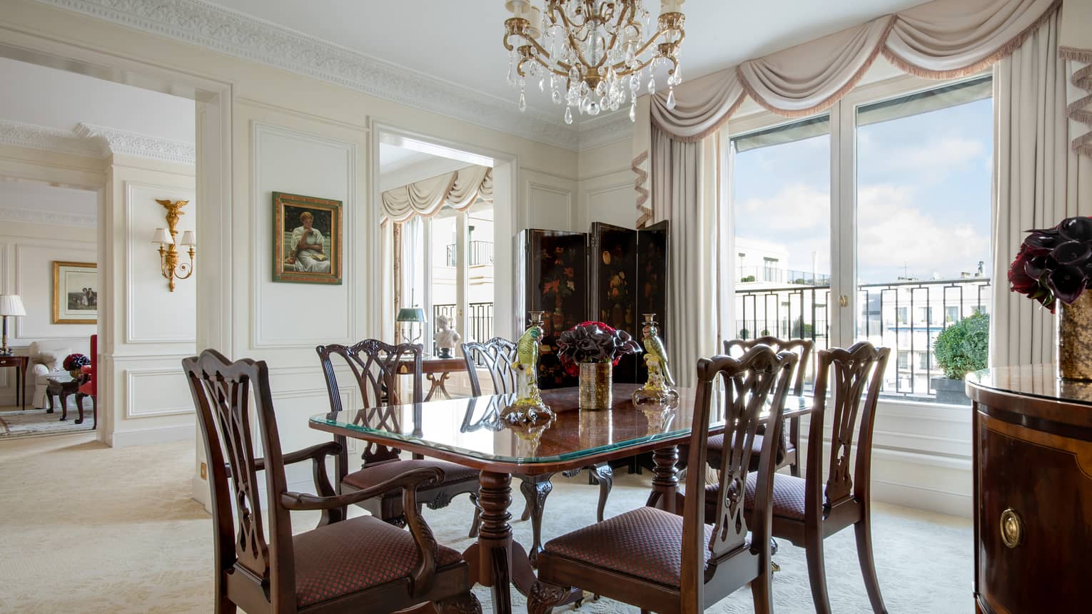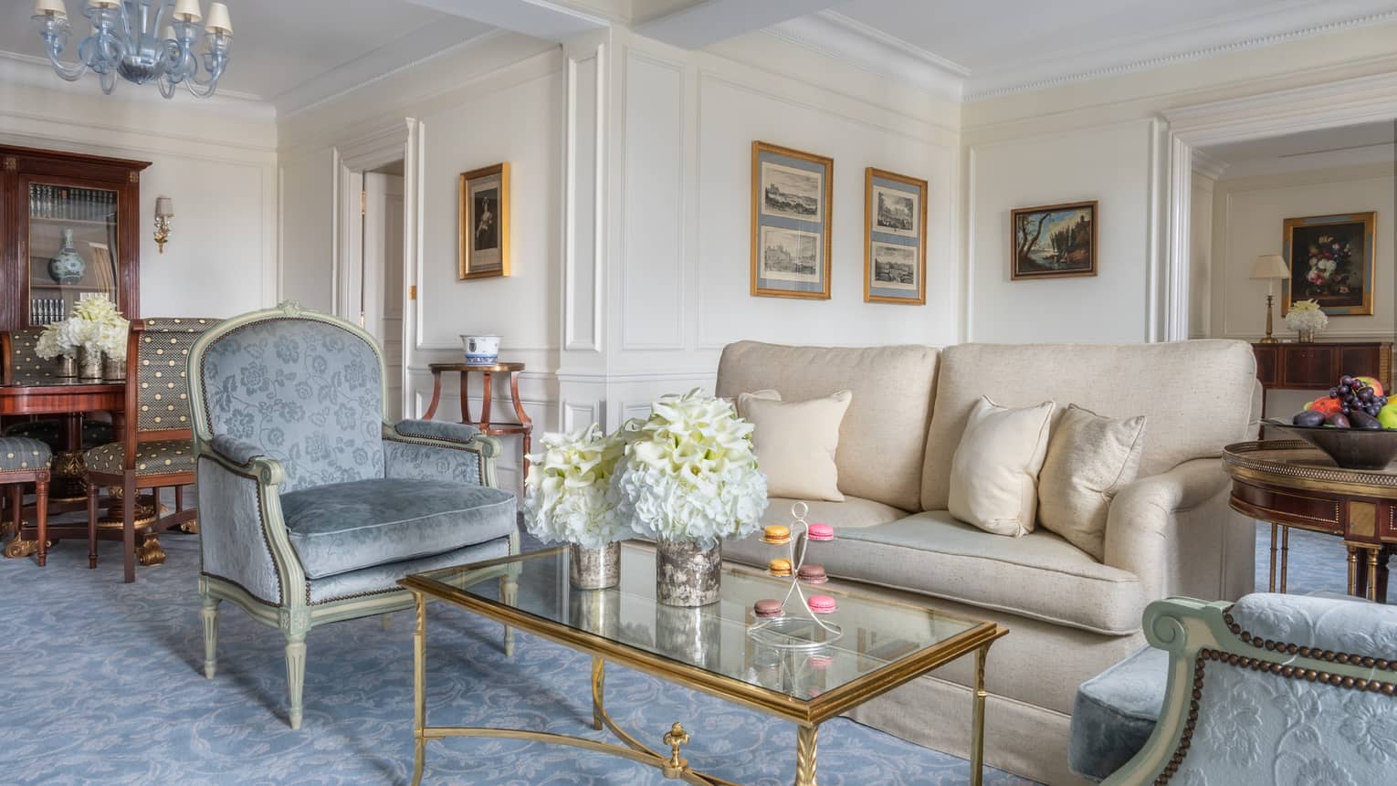 140 кв. м. Стильний люкс розташований на 4-му поверсі і складається з 1-ї або 2-х спалень, просторої вітальні, гардеробної, 1-ї або 2-х мармурових ванних кімнат з ванною та окремою душовою кабіною, гостьового туалету, повністю обладнаної кухні, мебльованого балкону. З номера відкривається чудовий краєвид на Avenue George V і Мармуровий двір. Максимальне розміщення: 4 дорослих або 2 дорослих та 2 дітей.
