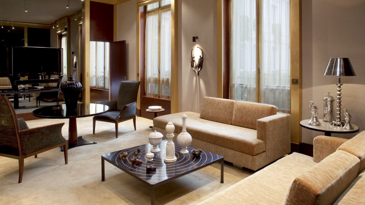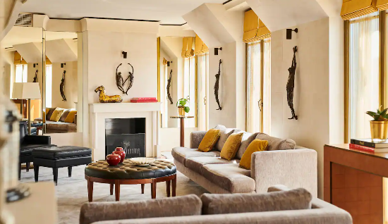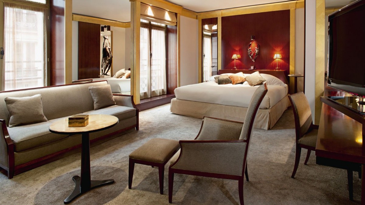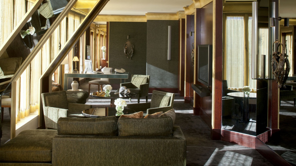 Насолоджуйтеся розкішшю в цьому дворівневому люксі площею 210 квадратних метрів (2260 квадратних футів), який має вражаючий хол заввишки шість метрів і два балкони з видом на Ейфелеву вежу, Вандомську колону та собор Паризької Богоматері. Спроектований у стилі шикарних паризьких апартаментів, люкс має два каміни, обладнану кухню, окрему робочу зону та власну спа-зону з турецькою лазнею, гідромасажною ванною, масажним столом, приватним тренажерним залом і перукарнею. Це вишуканий будинок для незабутнього відпочинку в Місті Вогнів.