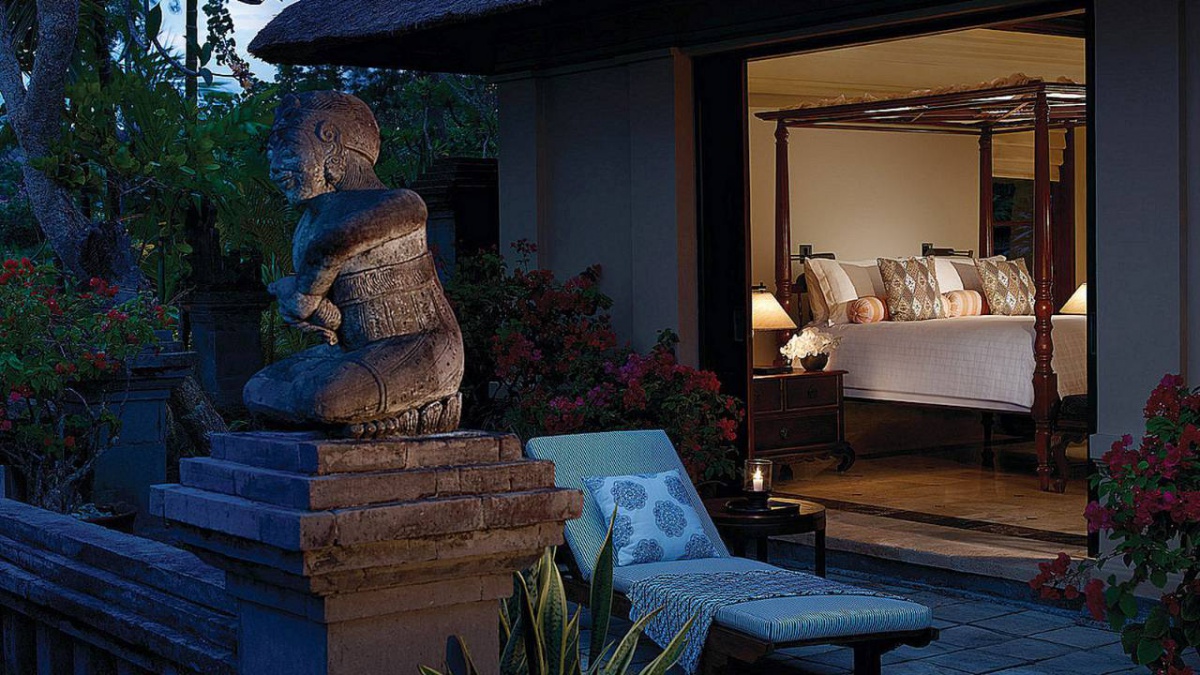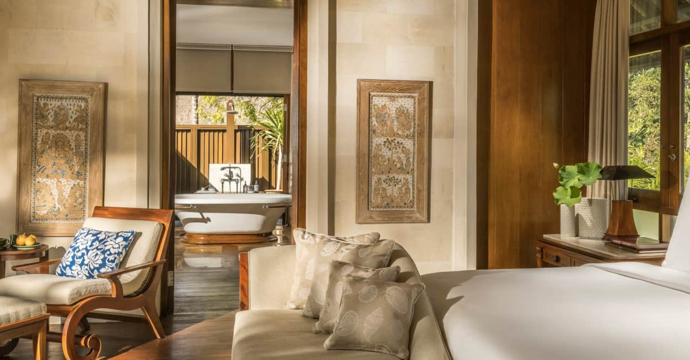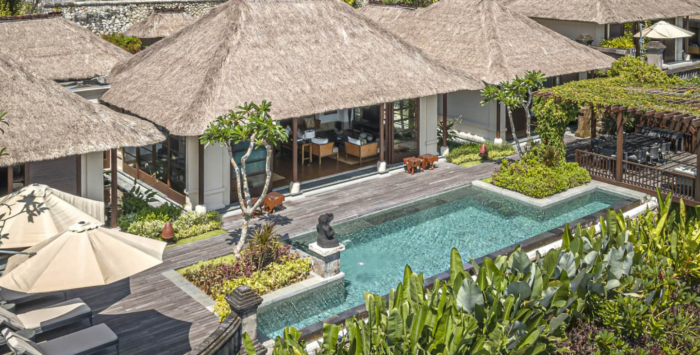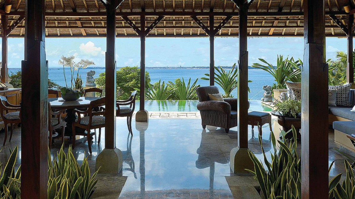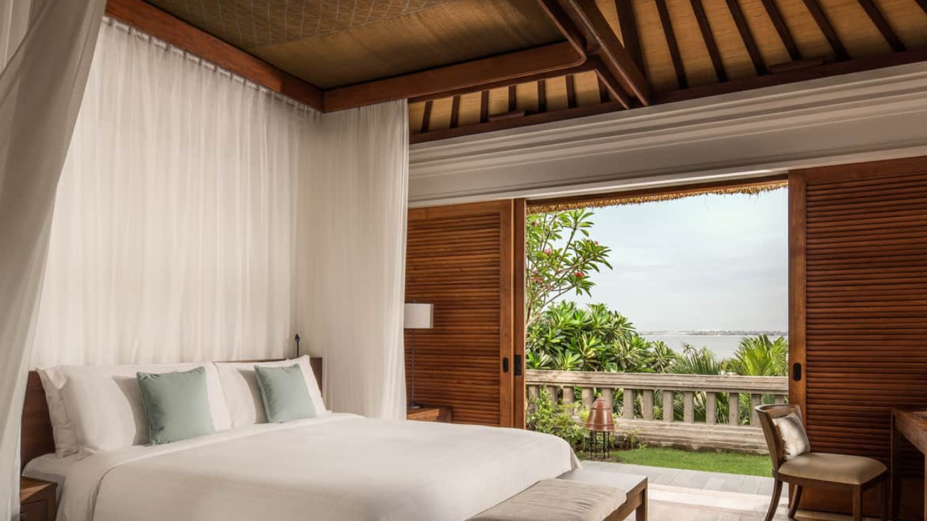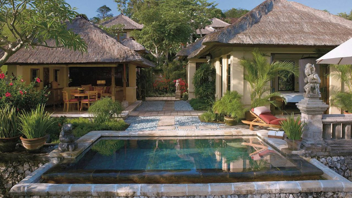 В оточенні густої тропічної зелені та красивих пагорбів, які підходять прямо до пляжу з білосніжним піском, розмістилися гарні вілли та павільйони Four Seasons Resort Bali at Jimbaran Bay, оформлені в класичному індонезійському стилі. Вілли прикрашені акуратними солом'яними дахами. Кожна вілла має терасу з власним басейном. В елегантному інтер'єрі номерів оздоблення з натурального дерева, розкішних тканин, бамбука, а також предмети мистецтва та витончені меблі у балійському стилі.