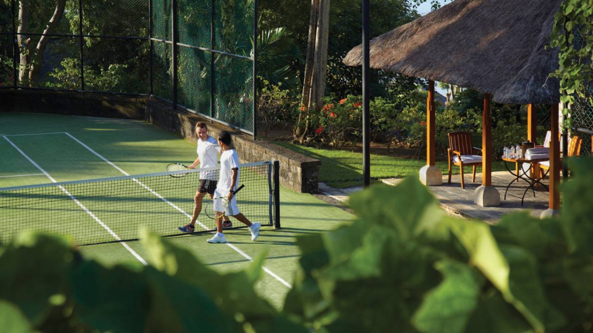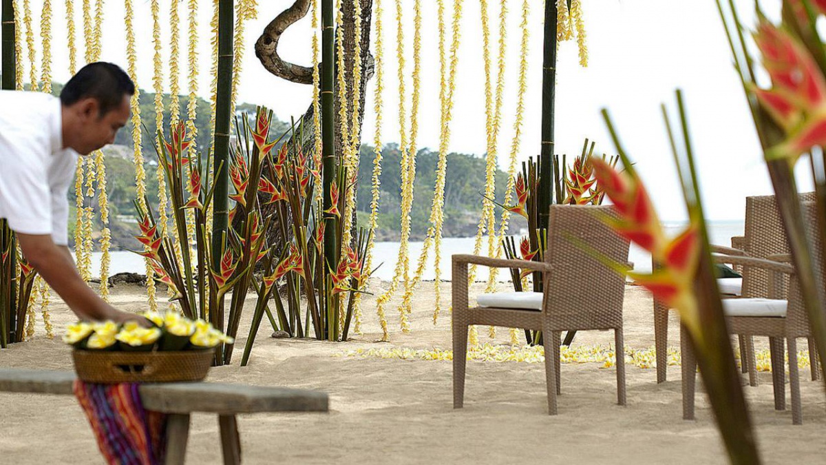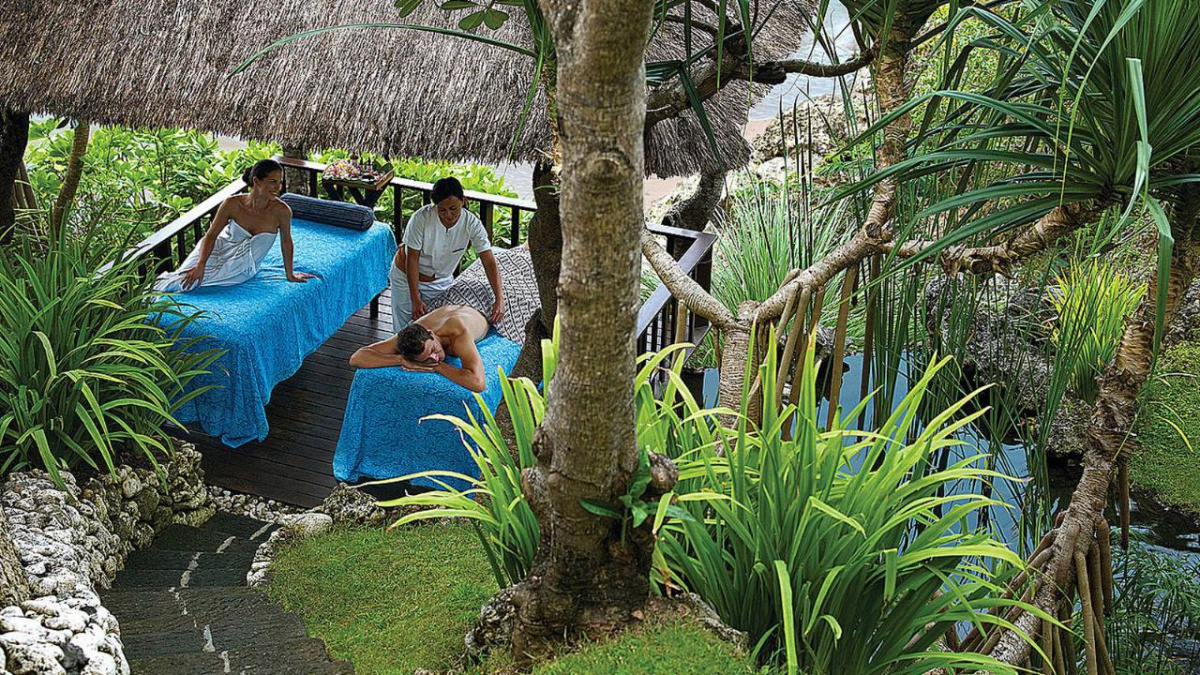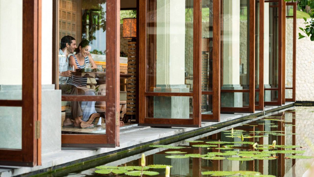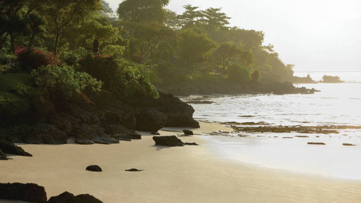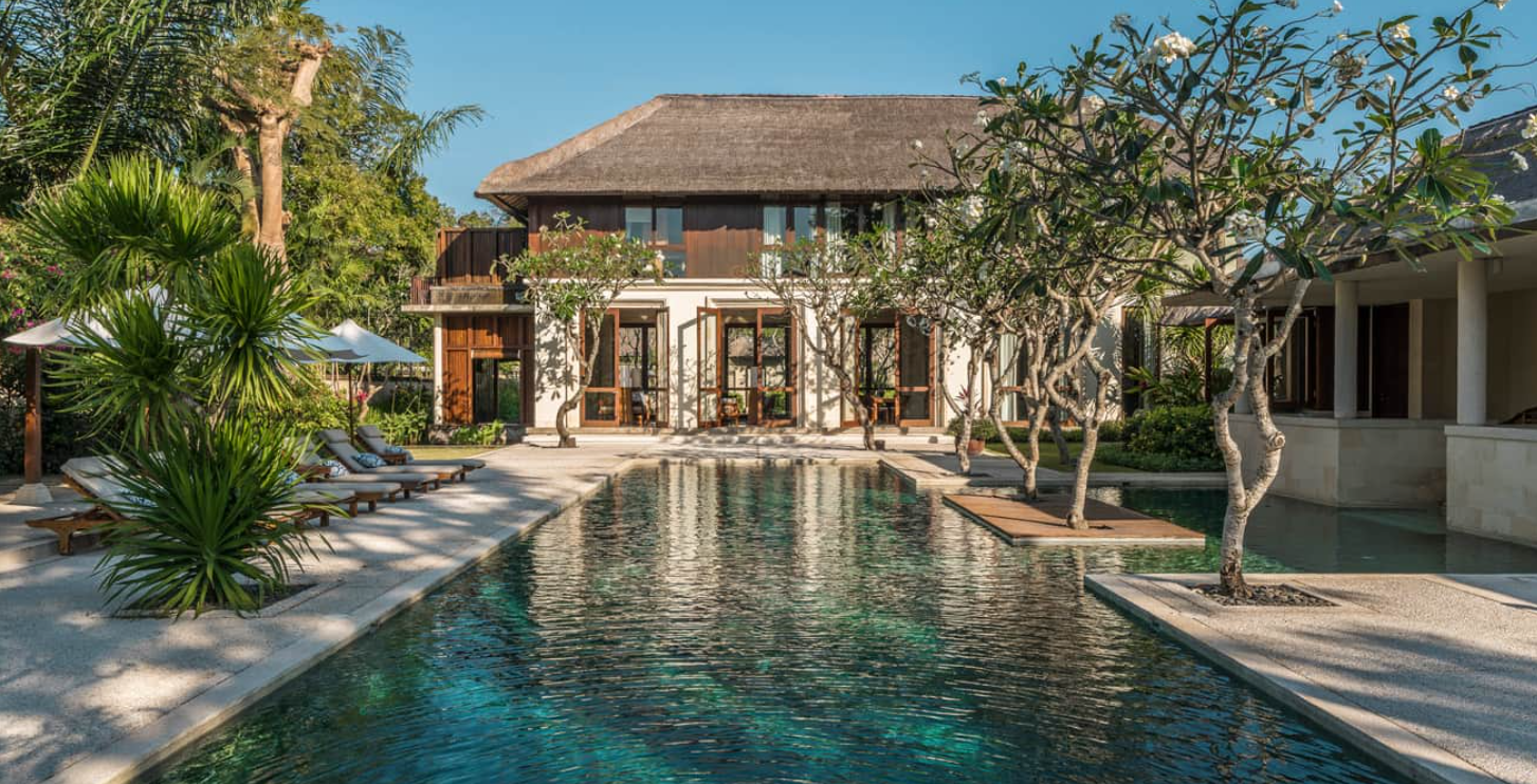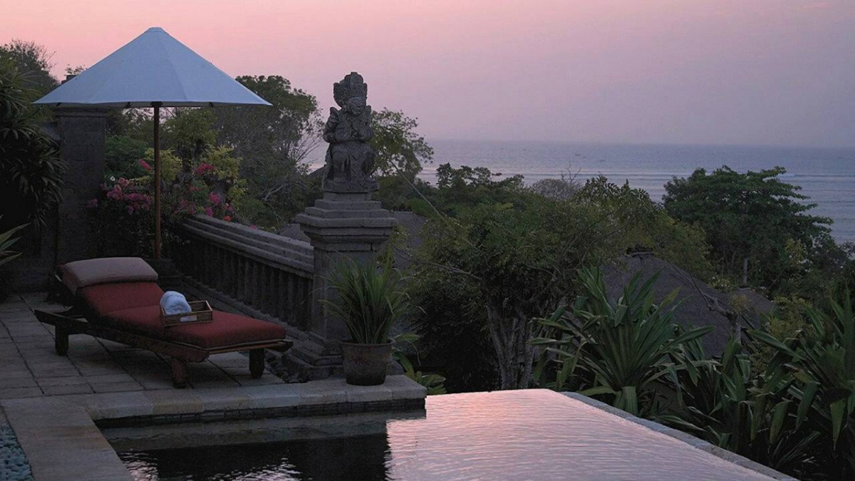 В оточенні густої тропічної зелені та красивих пагорбів, які підходять прямо до пляжу з білосніжним піском, розмістилися гарні вілли та павільйони Four Seasons Resort Bali at Jimbaran Bay, оформлені в класичному індонезійському стилі. Вілли прикрашені акуратними солом'яними дахами. Кожна вілла має терасу з власним басейном. В елегантному інтер'єрі номерів оздоблення з натурального дерева, розкішних тканин, бамбука, а також предмети мистецтва та витончені меблі у балійському стилі.