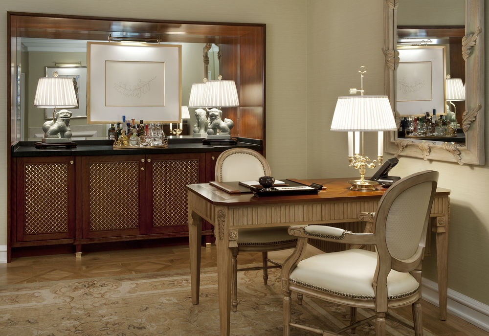 Полулюкс: 209 кв.м. Гостинний номер з панорамним видом на місто і фонтаном, що поєднує декор у західних і східних стилях з зеленими відтінками і прикрашений старовинними роботами азіатського мистецтва на 4-му поверсі складається з лаунж, ліжка з двоспальним ліжком з барами, гостьовий номер з вогнем і валиком, їдальня з червоною їдальні. Місце чотири. Гості можуть скористатися готелем.
