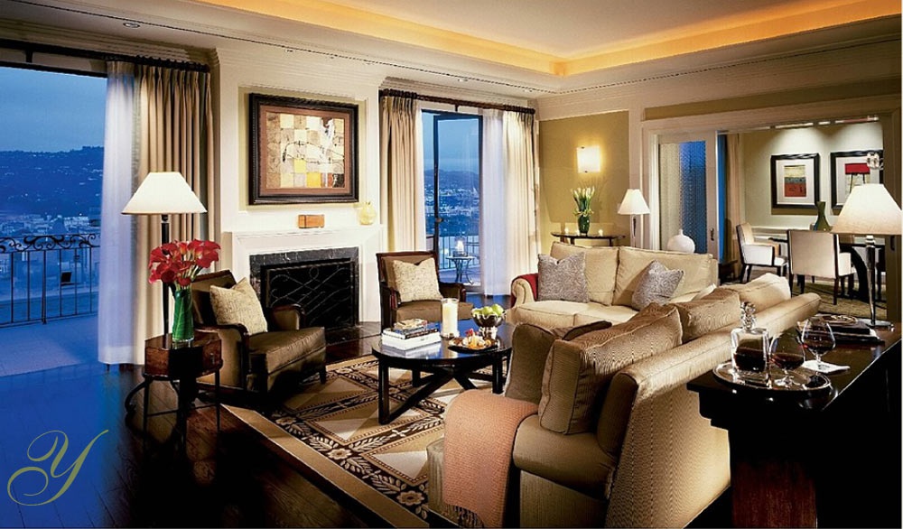 Полулюкс205 кв.м. У кінозалі, розташований на 14 поверсі в Beverly wing, складається з гостьової зони відпочинку та обідньої зони 6 осіб, 2 санвузли з king-size ліжками, 2 санвузли, гостьова ванна кімната, гальванічне балкон з панорамним видом на Лос-Анджелес і Санта-Меніка. Розміщення 4 дорослих або 2 дорослих + 2 дітей до 10 років. Чи може бути додаткова спальня.