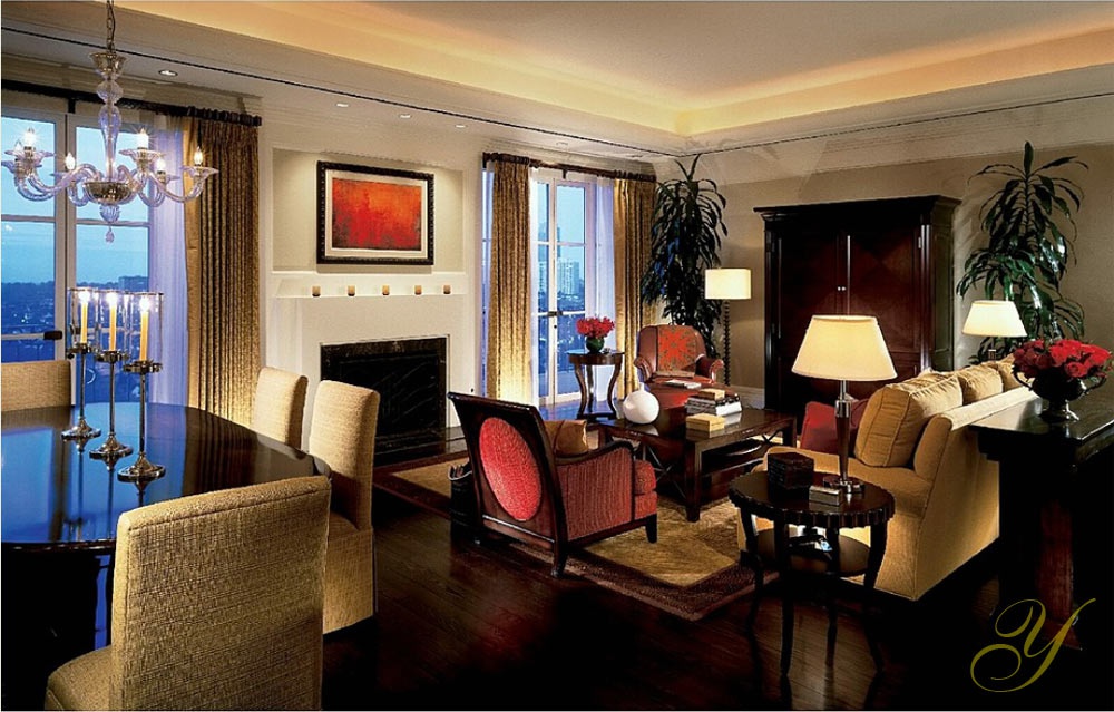 Beverly Президентський Люкс297 кв.м. Розкішна 3-метрова стеля розташована на 14 поверсі в Beverly wing, що складається з гостьової кімнати, 8-особистої їдальні, кімнати з підігрівом, два ліжка з king-size ліжками, зона відпочинку, номери та санвузли з джакузі та душовими кабінами, гостьовий номер з периметровим приміщенням.Двокімнатний балкон з панорамним видом на Голлівудські пагорби. Розміщення 4 дорослих або 2 дорослих + 2 дітей до 10 років.