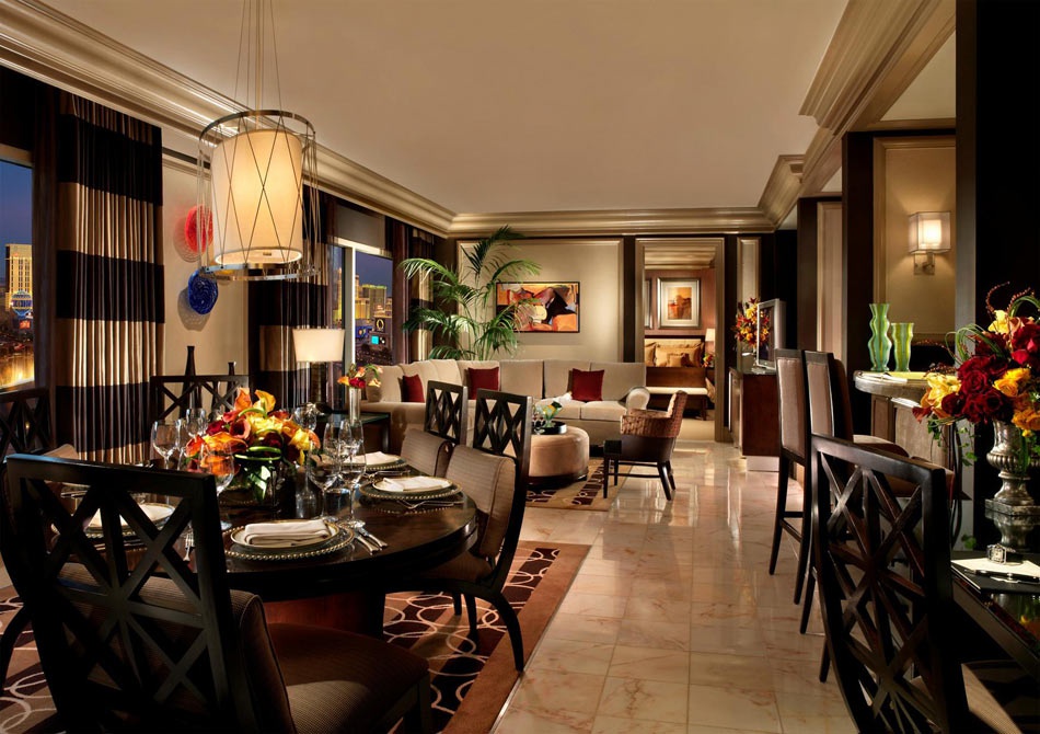 Президентський Люкс: 380 кв.м1 часй На одному з верхніх поверхів готелю. З вікон ми можемо бачити червоний захід сонця (Західний експонат). Чудовий номер в сучасному стилі. У номері є відкритий тераса, зимовий сад з фонтаном, каміном, баром. У кожній з двох спалень є ванна кімната з гарячою ванною, паровою кабіною. У номері є кав'ярня. Вартість проживання складається з послуг баттера 24 години на добу, VIP циркулі «О», VIP-реєстрація, пріоритетне бронювання кращих місць в кращих ресторанах, клубах і шоу MGM MIRAGE. Додаткове розміщення в номері категорії Entourage Suites на одному поверсі можливе для супроводу.