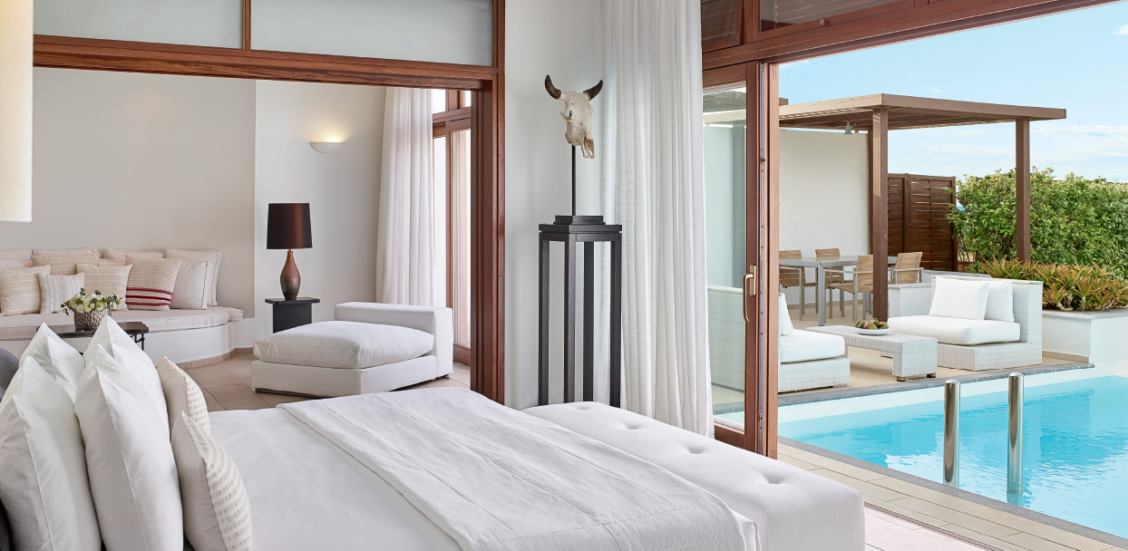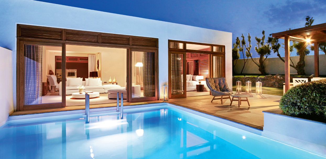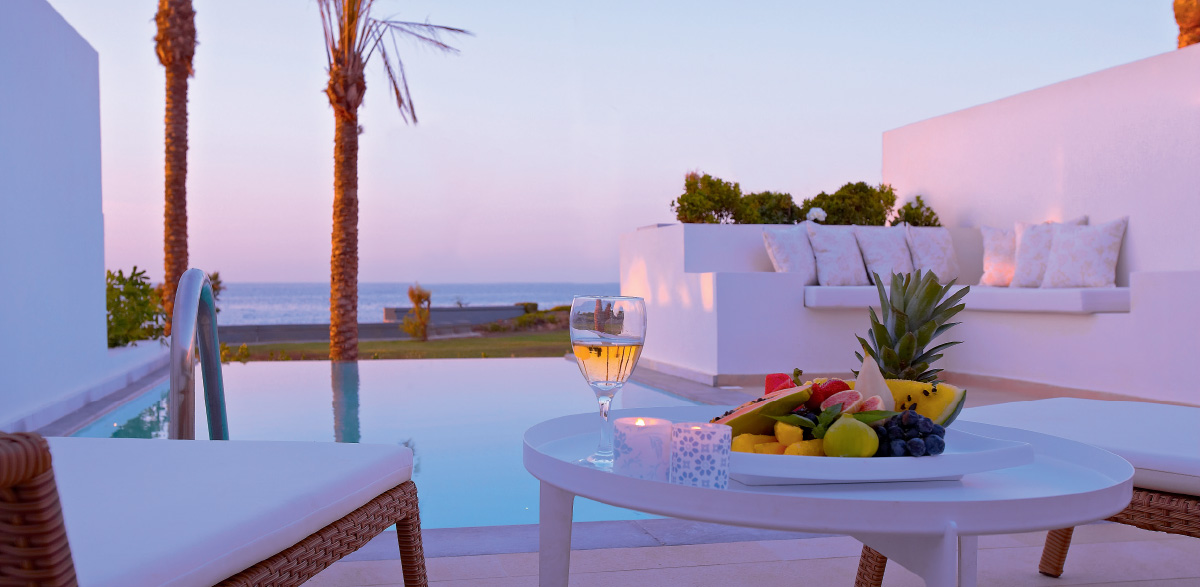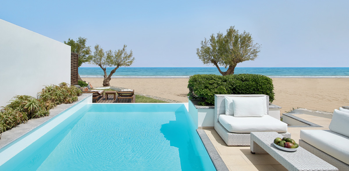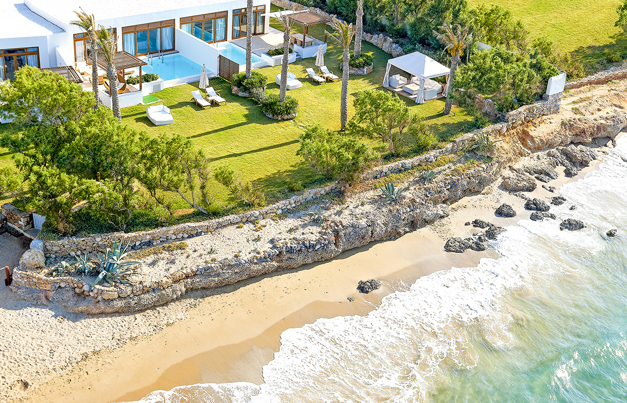 На відкритому просторі (53 кв. м) – приватний басейн Amirandes «Star» (23 кв. м) з контролем температури води та водним потоком, тераса з комфортними літніми меблями, їдальнею та вітальнею, шезлонгами, приватний дворик з садом. Вид на море або сад. До послуг гостей приватний намет на пляжі, холодильник для вина. Максимальне розміщення – 2 дорослих та 2 дітей.