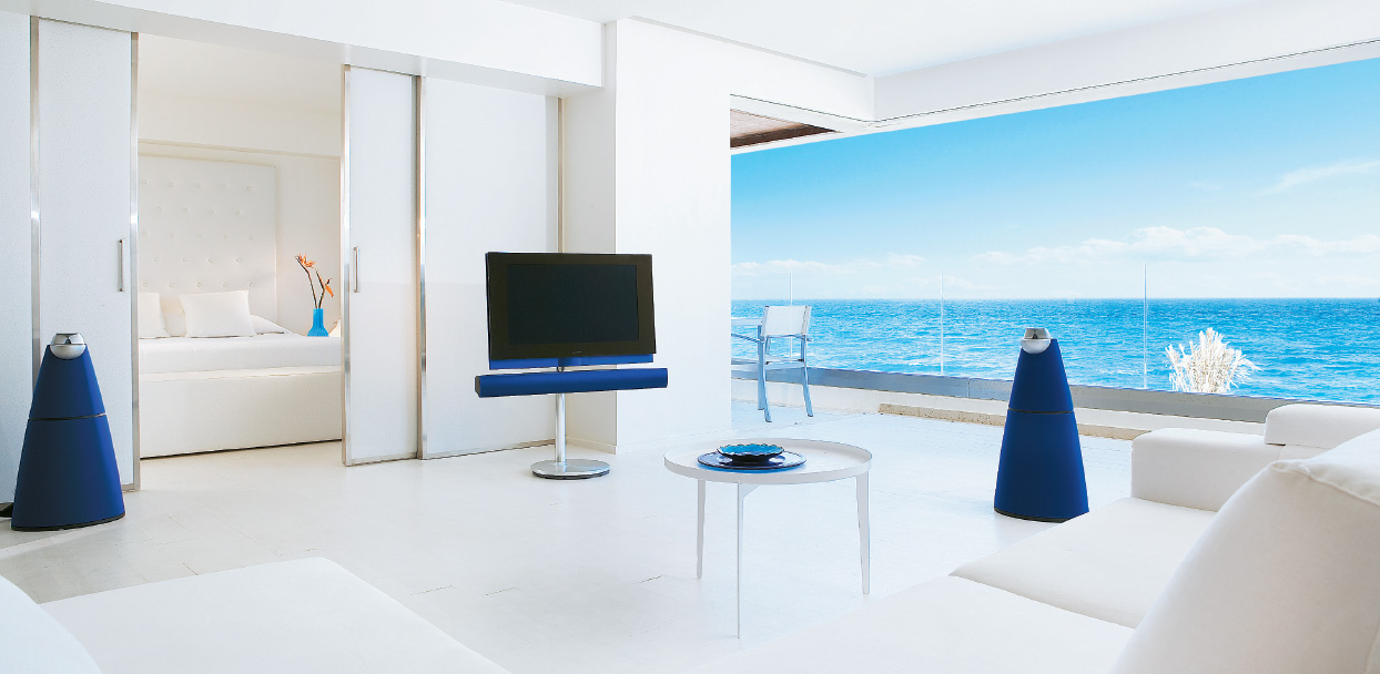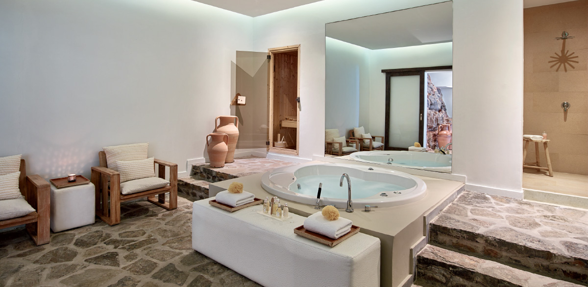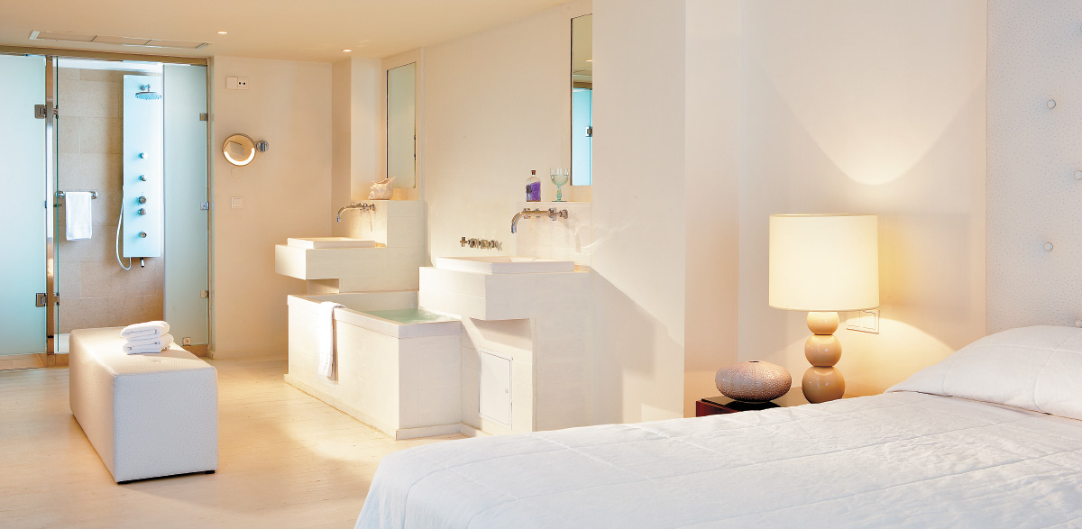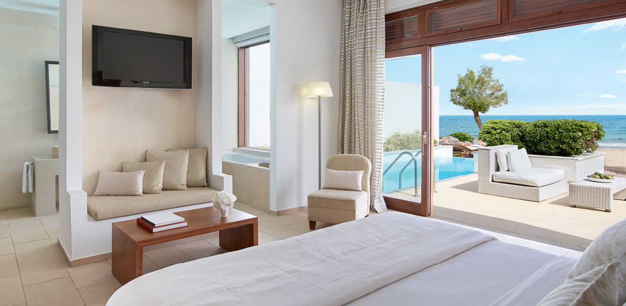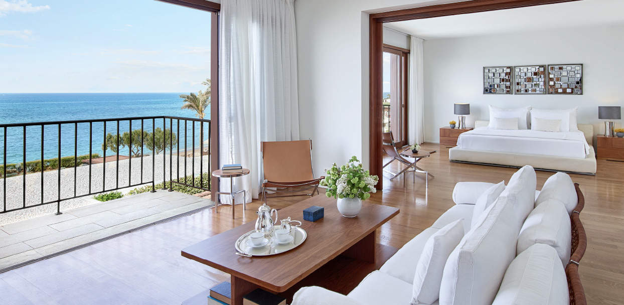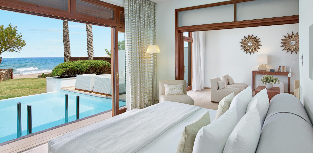На відкритому просторі (53 кв. м) – приватний басейн Amirandes «Star» (23 кв. м) з контролем температури води та водним потоком, тераса з комфортними літніми меблями, їдальнею та вітальнею, шезлонгами, приватний дворик з садом. Вид на море або сад. До послуг гостей приватний намет на пляжі, холодильник для вина. Максимальне розміщення – 2 дорослих та 2 дітей.
