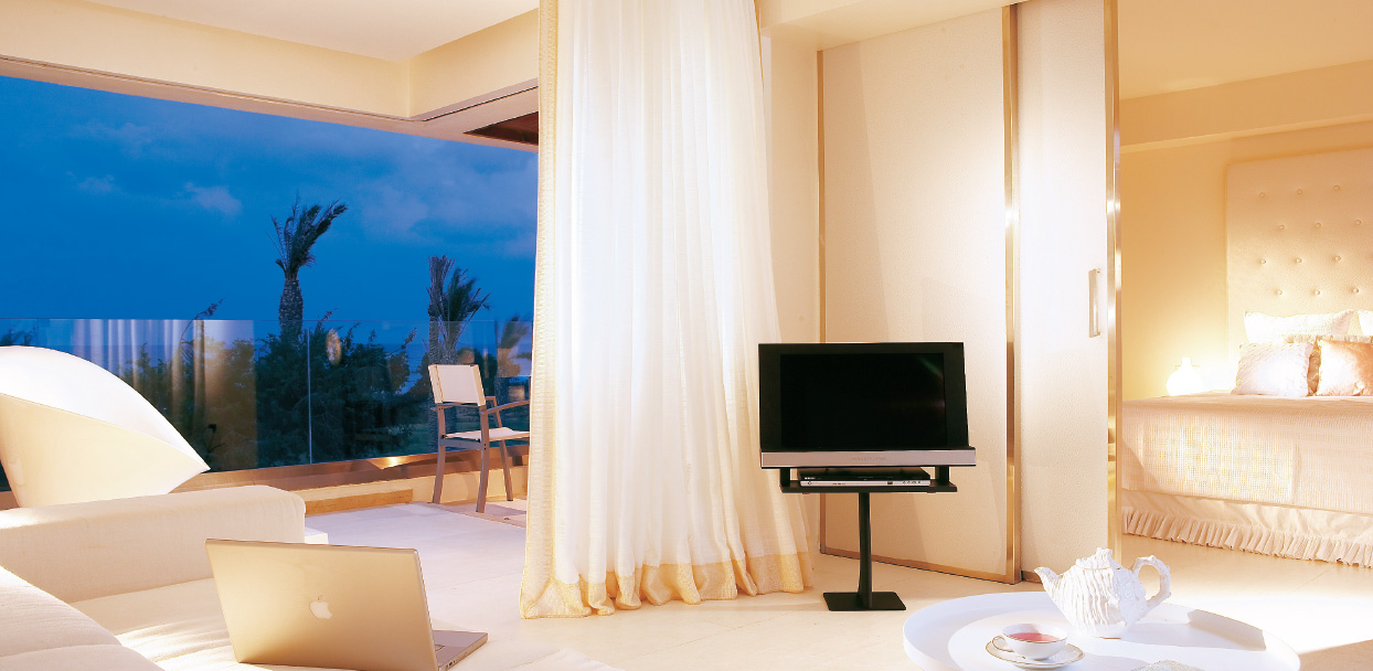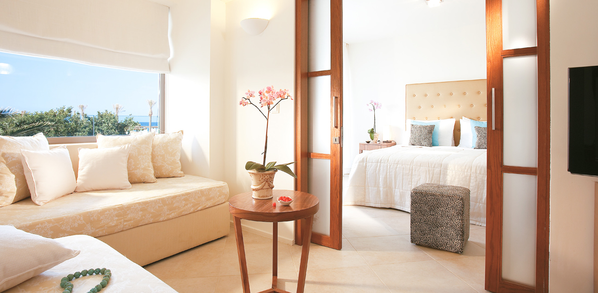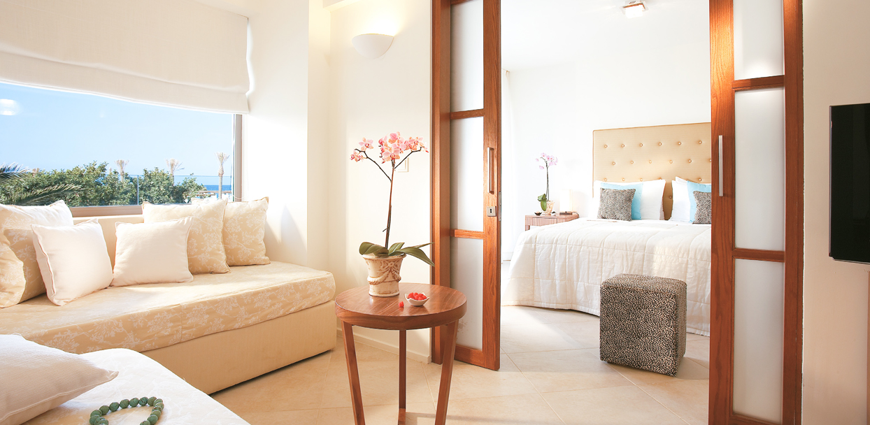 40 кв. м. Розташовується у крилі Candia, другий та третій поверх. Планування номера: спальня з ліжком King size, дитяча кімната з 2 ліжками, вітальня, ванна кімната з душовою кабіною, ванною, раковиною та туалетним столиком, вбиральня, мебльований балкон (6 кв. м). Вид на мальовничий сад або море. Максимальне розміщення – 2 дорослих та 2 дітей.