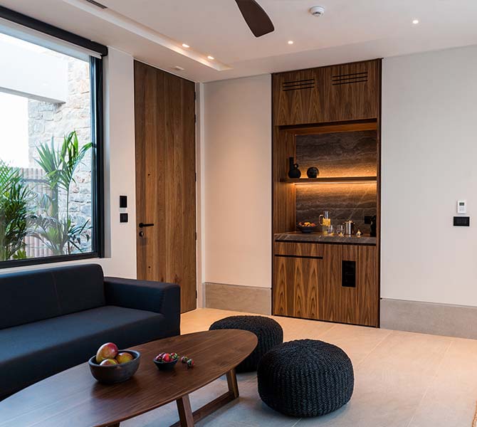 Кожна з вілл комплексу Domes Luxury Residents (площею від 400 кв.м до 600 кв.м) розташована на приватній території та надає простору та комфортну вітальню, повністю обладнану кухню, приватний плавальний басейн та клубні електромобілі для легкого пересування по території курорту.