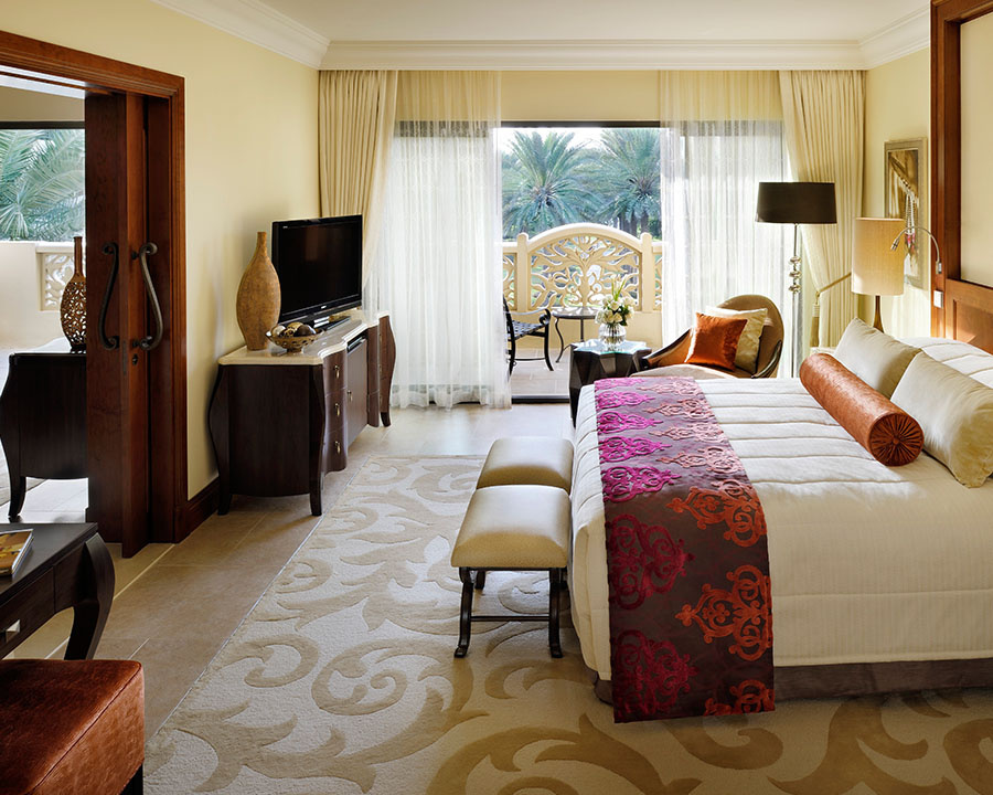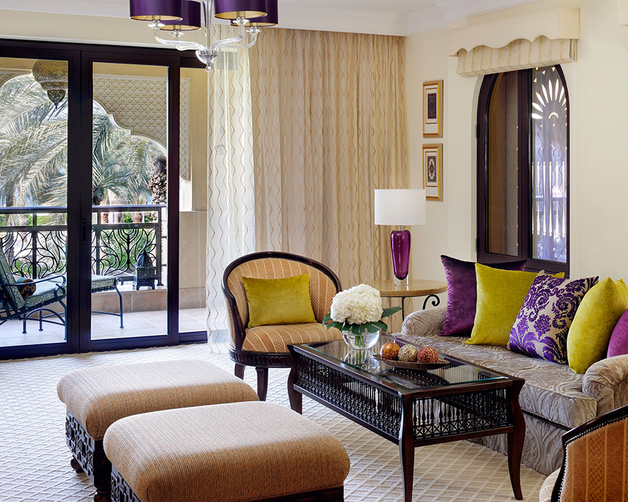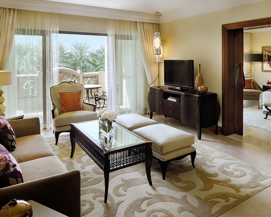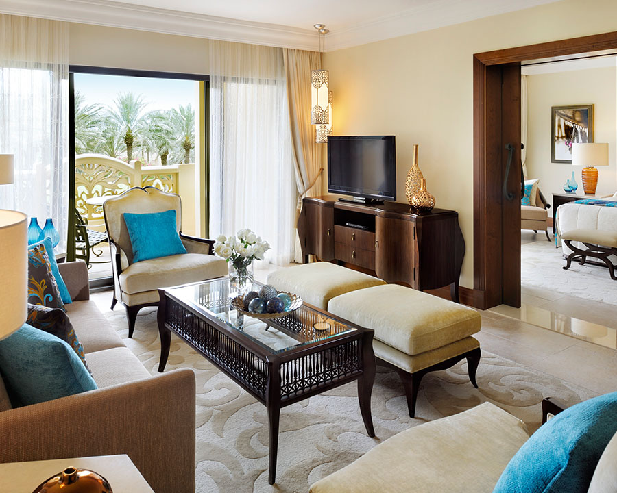100 кв. м Просторий люкс представницького класу розташувався у південному крилі The Palace. Номер має спальню з ліжком розміру «king-sizе», їдальню з обіднім столом на чотири персони, вітальню, ванну кімнату з ванною, душовою кабіною та подвійною раковиною, гостьовий туалет, балкон або затишне патіо. З панорамних вікон відкривається чудовий краєвид на Аравійське море і прекрасний сад. Розміщення: 3 особи.
