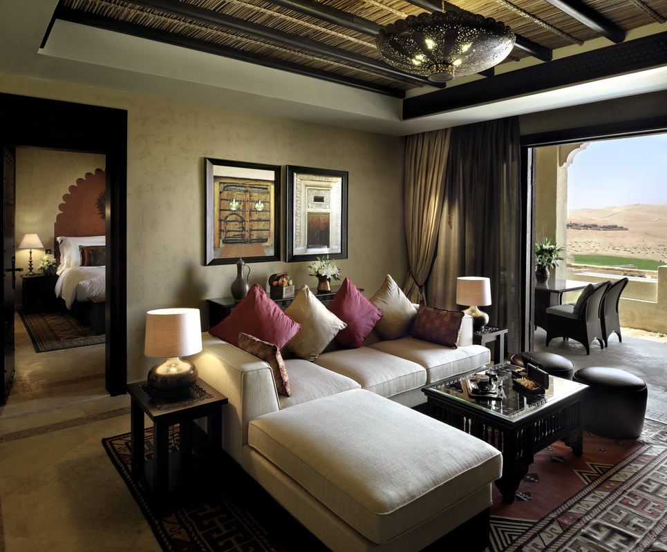 У готелі є 206 комфортабельних номерів: 70 Deluxe Rooms, 42 Deluxe Balcony Rooms, 28 Deluxe Terrace Rooms, 14 One-Bedroom Suites, 52 Villas (One-Bedroom Villa, Two-Bedroom Villa, Three-Be). У номерах, виконаних у теплих золотисто-коричневих тонах, розкішні інтер'єри з вишуканим арабським декором: високі дерев'яні стелі, килими з традиційним орнаментом, меблі з дорогих порід темного дерева, срібні та бронзові світильники; тераси/балкони з дивовижними видами саду готелю та пустелі Liwa.