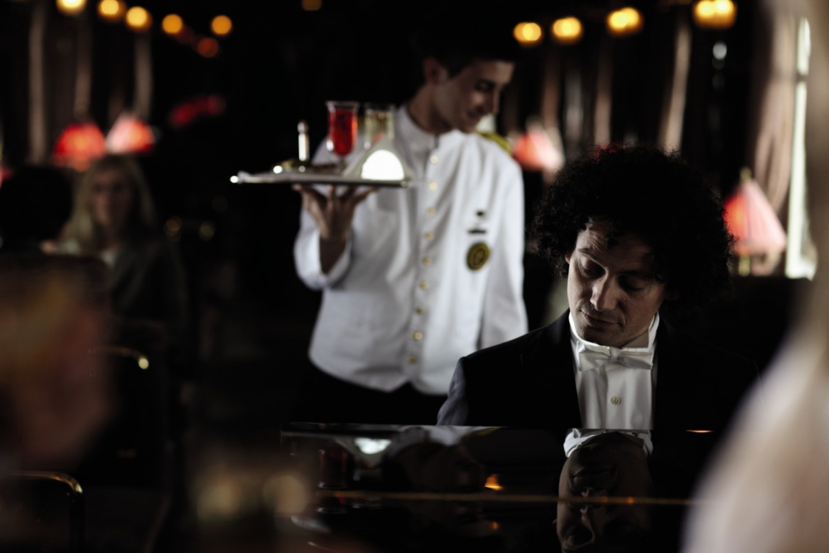 У центрі поїзда стильний автомобільний бар має гостинну атмосферу, в якій приємно відпочивати коктейль або чашку кави. Це гарне місце, щоб поговорити з супутниками і слухати фортепіано.